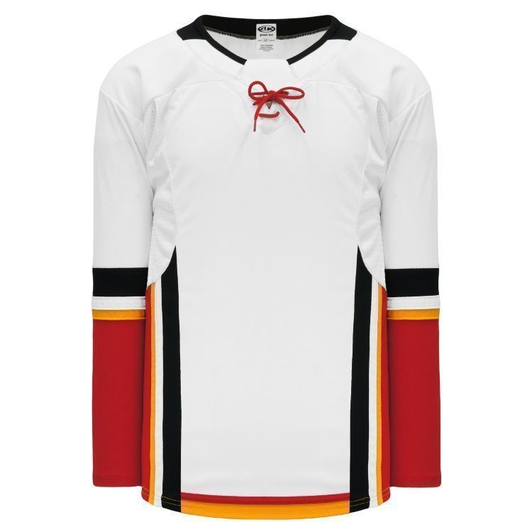 Calgary Flames blank hockey jerseys feature pro-weight AK-Knit fabric with contrast color knitted shoulder and sleeve trim. AK CAL718D CAL719D home and away Calgary Flames blank hockey jerseys also feature 2-layers of material on the shoulders / elbows, an edge lace up neck design and underarm mesh gussets. Buy blank or customize with screen printing or twill. Choose from youth through adult goalie sizes.