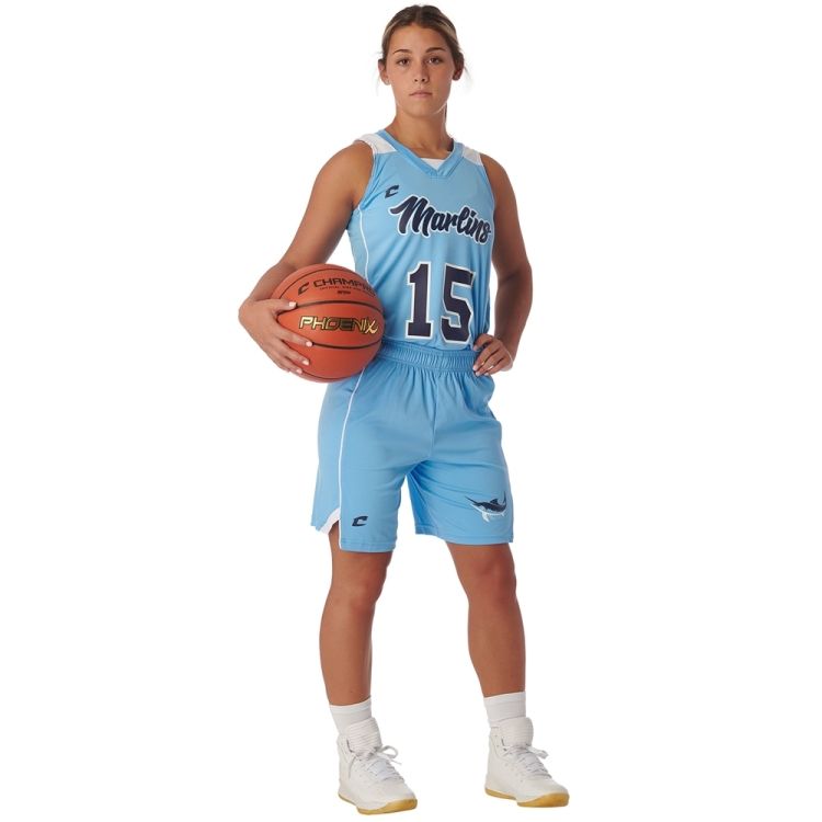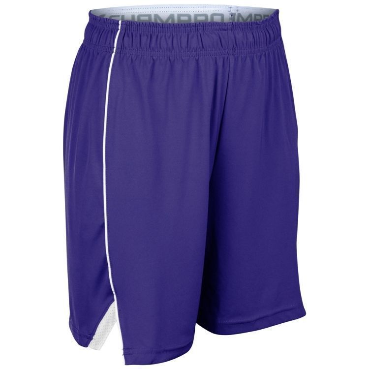 Champro BBS23W womens wicking basketball shorts features 100% polyester active cloth wicking interlock fabric with pin-dot mesh side inserts. Champro BBS23W ladies shorts have a covered elastic waistband with inside draw cord, 8" inseam, full athletic cut and contrast color side seam piping.