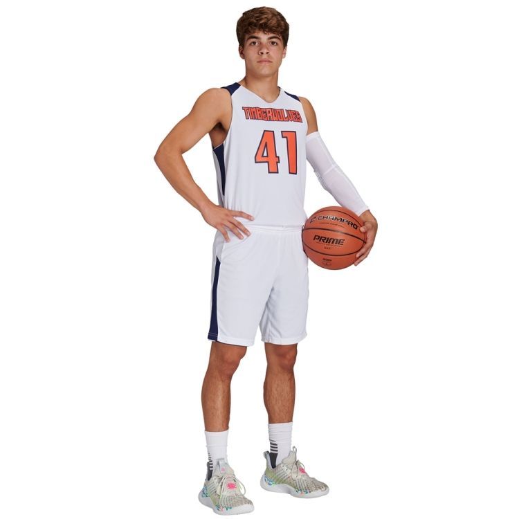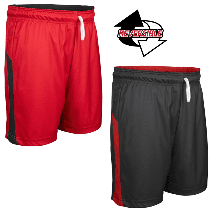 Champro BBS41 wicking reversible basketball shorts features 100% polyester birds eye mesh fabric with contrast color side stripes. Champro BBS41 shorts are fully reversible for wearing on either side and also have a covered elastic waistband with inside draw cord, 9" inseam and full athletic cut.