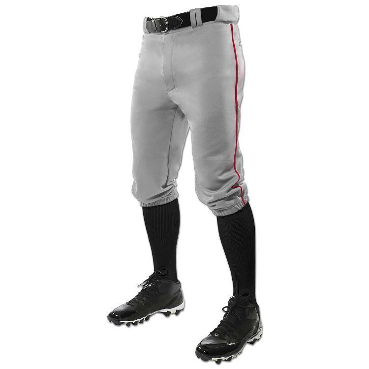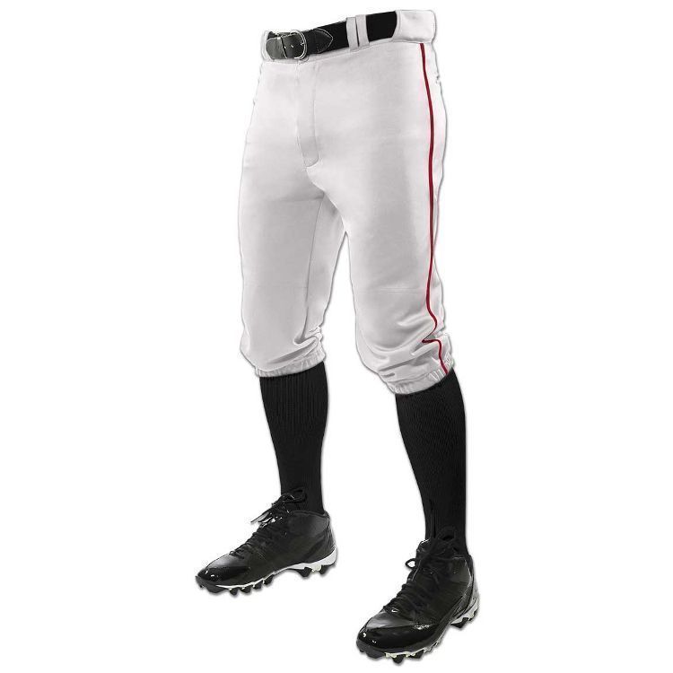 Champro BP70 model.Champro BP101 piped baseball knicker pants are made of 14oz. Tek- knit fabric with 3/16 inch side seam piping. Champro piped baseball knickers have a knicker cut with elastic bottoms, 2-1/2 inch wide waistband with gripper waist, 7 pro style belts loops, double reinforced knees, dual snap closure with zipper fly, two inset back pockets and a straight leg relaxed fit.
