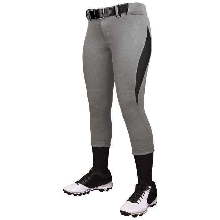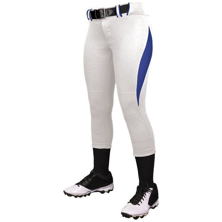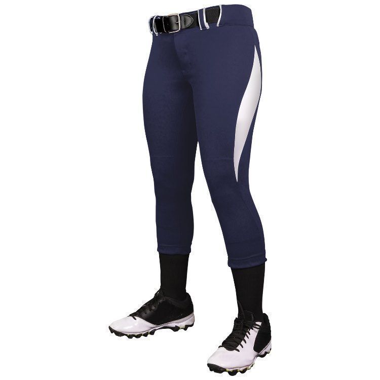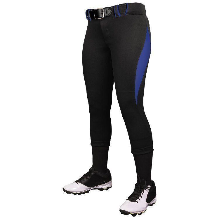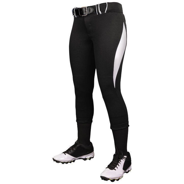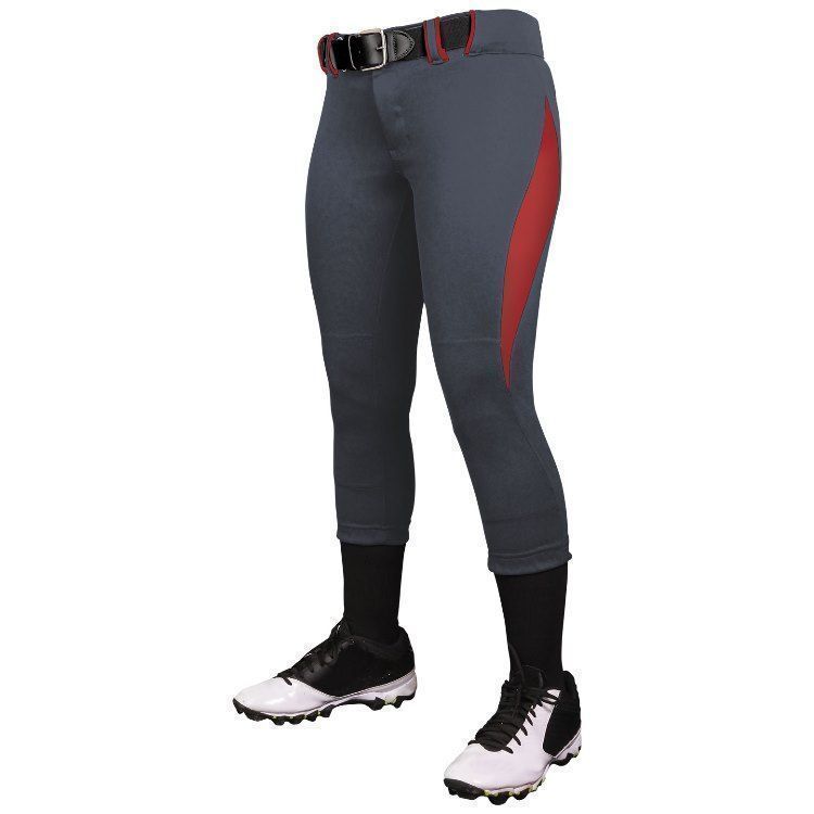 Champro BP28 striped softball pants are made of 14oz. Tek-knit fabric with 4-way stretch with contrast color side stripes. Champro striped softball pants have a low rise cut, tapered legs with elastic hems, 2-1/2 inch wide waistband with gripper waist, 7 pro style belts loops, double reinforced knees, dual snap closure with zipper fly and two inset back pockets with contrast trim.