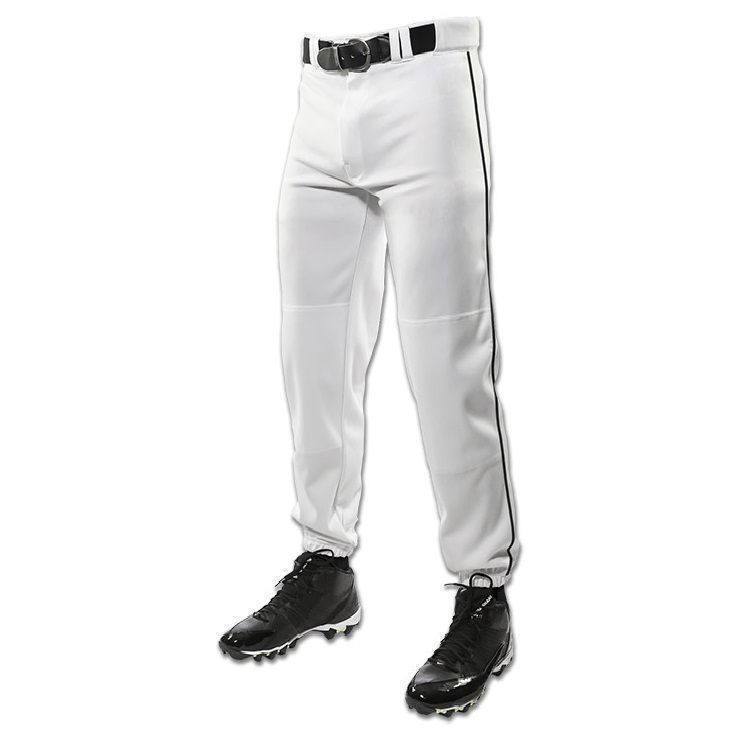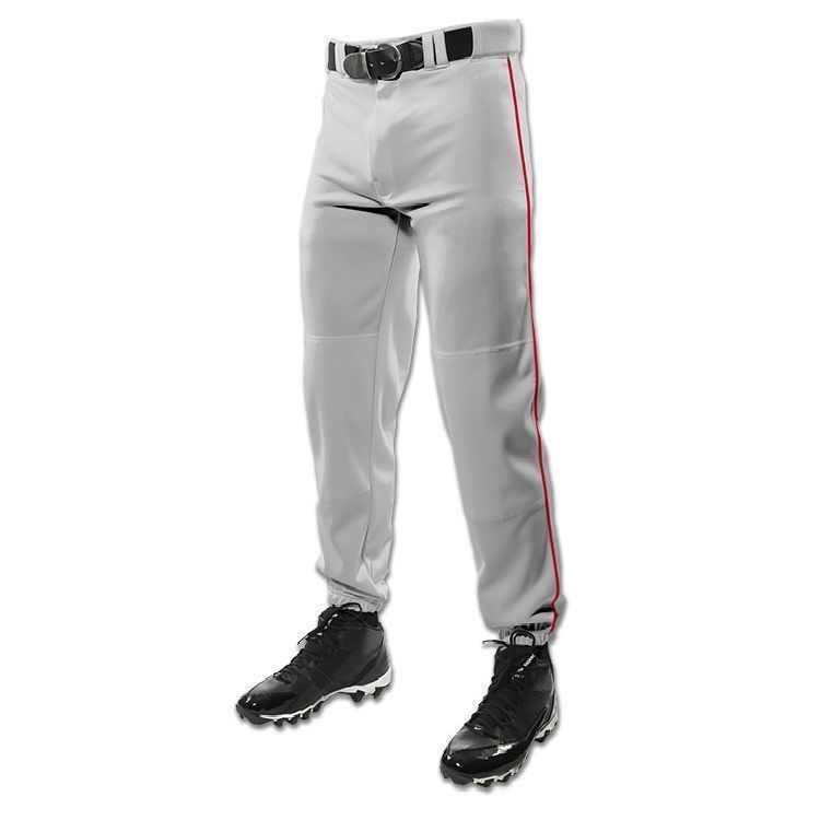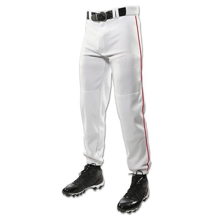 Champro BP91 piped baseball pants are made of 14oz. Tek-knit fabric with 3/16" side piping. Champro piped baseball pants have elastic bottom hems, 2-1/2 inch wide waistband with gripper waist, 7 pro style belts loops, double reinforced knees, dual snap closure with zipper fly, two inset back pockets and a ankle length design.