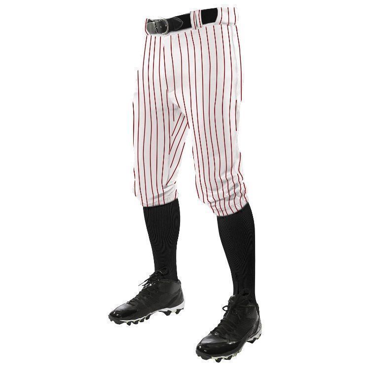 Champro BPPINK pinstripe baseball knicker pants are made of 13oz. warp knit fabric with knit in pinstripes. Champro pinstripe baseball knickers have a knicker cut with elastic bottoms, 2-1/2 inch wide waistband with gripper waist, 7 pro style belts loops, double reinforced knees, dual snap closure with zipper fly, two inset back pockets and a straight leg relaxed fit.