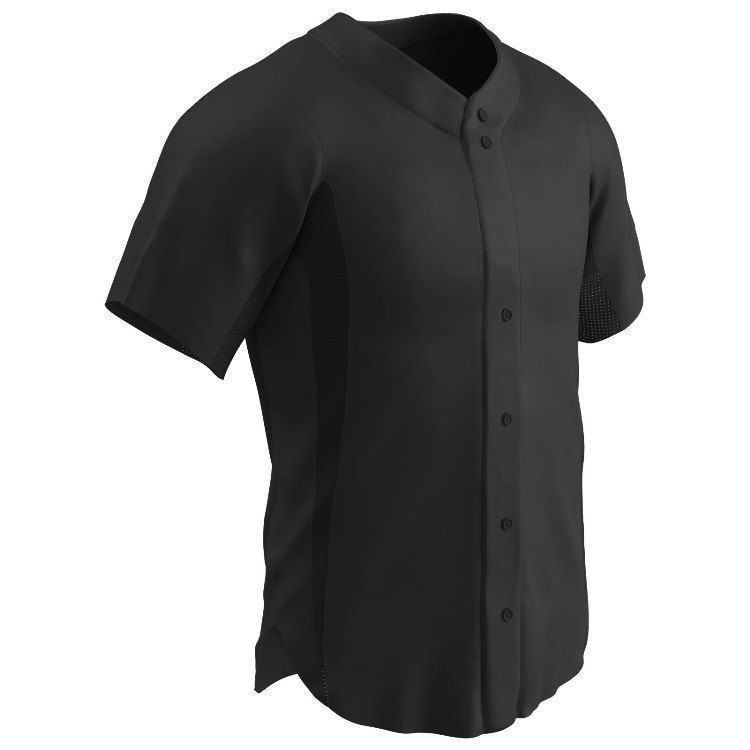 Champro BS149 full button baseball jersey is made of 100% polyester Tek-Knit wicking fabric with pin-dot mesh side inserts. Champro BS149 jerseys have a 6 button front spaced for lettering, set in sleeves, double stitching and a droptail bottom tail hem. Youth through adult 3XL sizes.