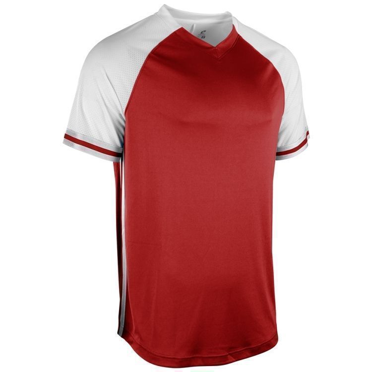 Champro BS50 Show v-neck baseball jersey is made of 100% polyester Active Cloth 2.0 wicking fabric with pin-dot mesh sleeves and back. Champro BS50 jerseys have a mitred v-neck collar, raglan sleeves, UPF 50+, contrast rib trim, double stitching and a slight rounded bottom hem. Youth through adult 3XL sizes.