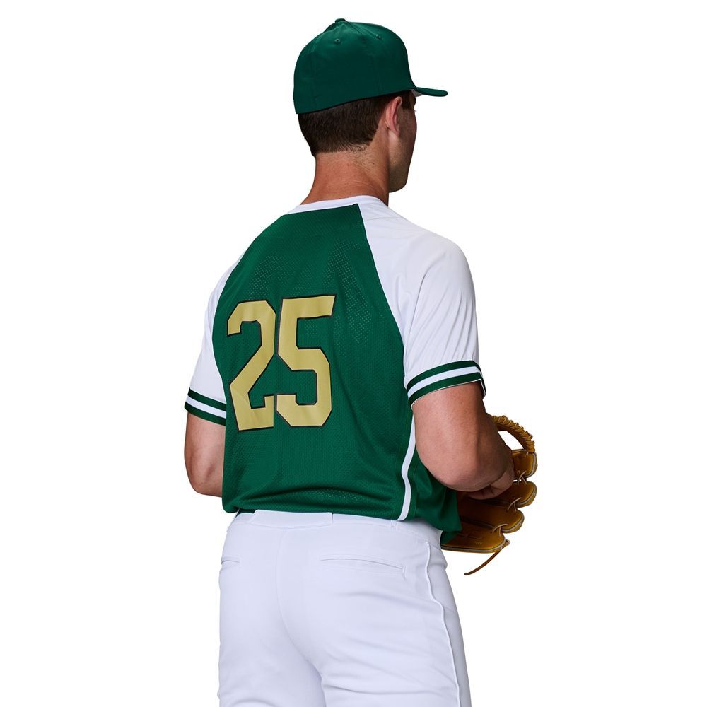 Champro BS51 Show 2-button baseball jersey is made of 100% polyester Active Cloth 2.0 wicking fabric with pin-dot mesh sleeves and back. Champro BS52 jerseys have a two button hidden placket, raglan sleeves, UPF 50+, contrast rib trim, double stitching and a slight rounded bottom hem. Youth through adult 3XL sizes.