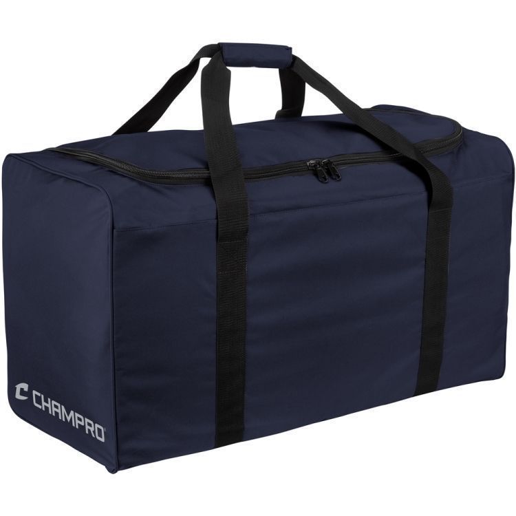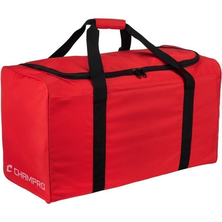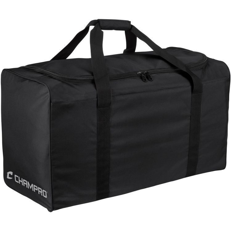 Champro E40 hockey gear bag features water resistant 600 denier polyester with D-shaped opening perfect for larger gear. Champro E40 bag has a 30 inch length, rigid bottom for durability, top dual zipper opening, wrap around carrying handles with Velcro closure, and fold flat design for storage.