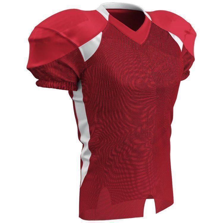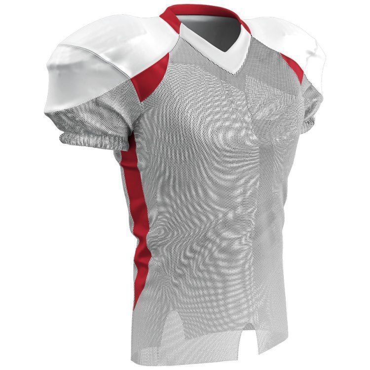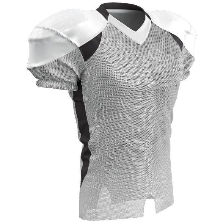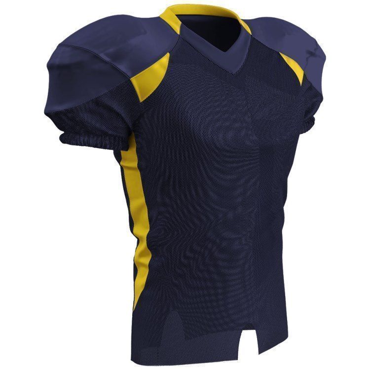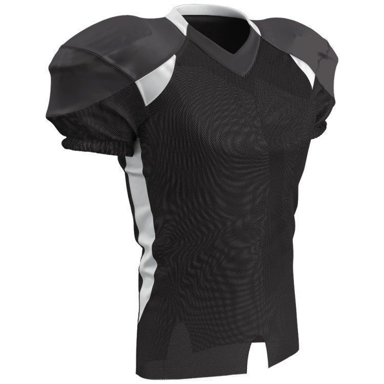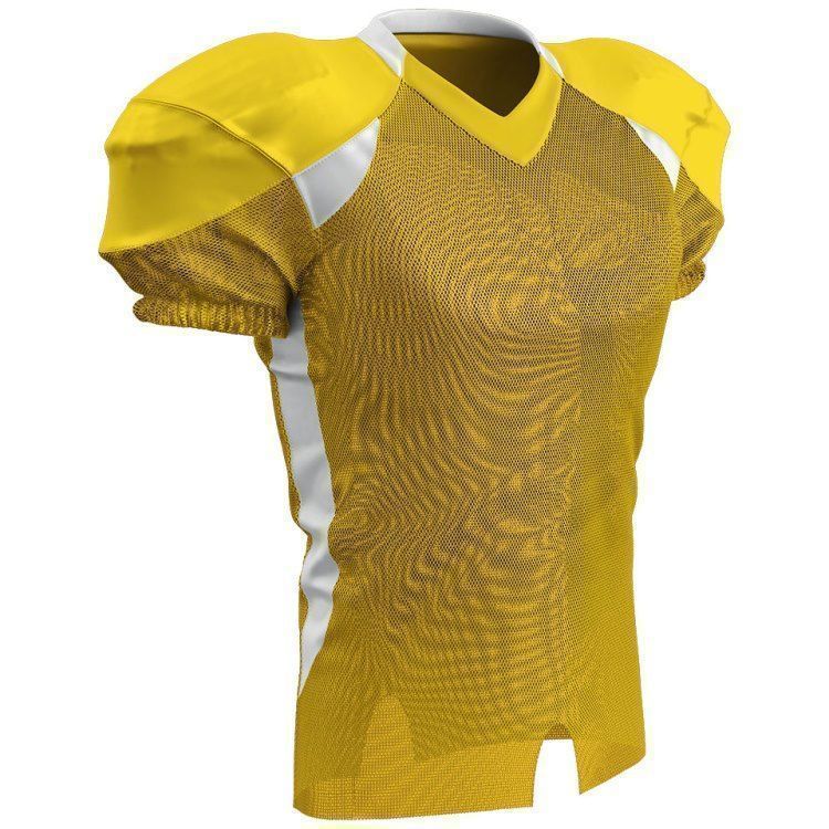 Champro FJ20 football jersey features polyester stretch mesh body / sleeves, polyester dazzle shoulders and 13% elastane stripes / side inserts for a fitted pro-style fit. Champro FJ20 jersey also features contrast shoulder inserts / sides, double ply cowl, mitered v-neck, coverstitched seams, and a full length body cut with motion vents.
