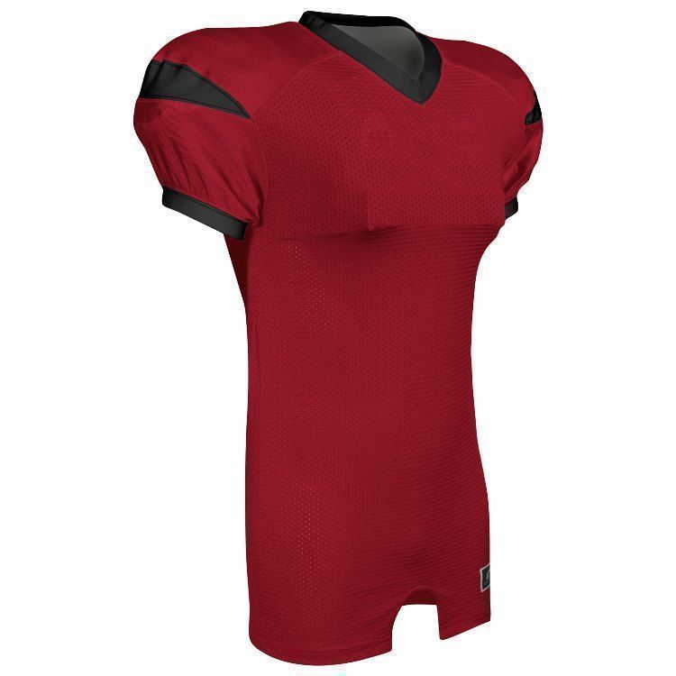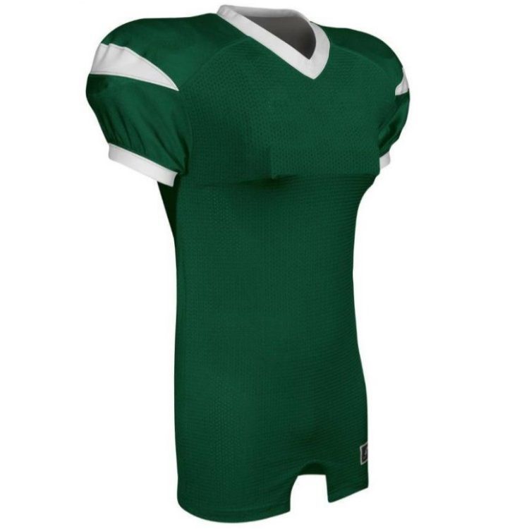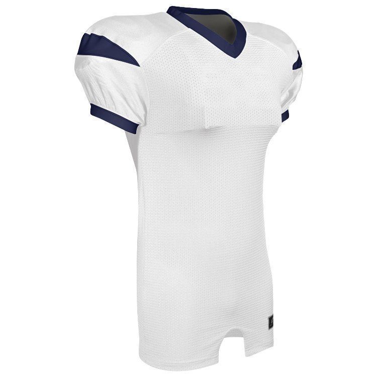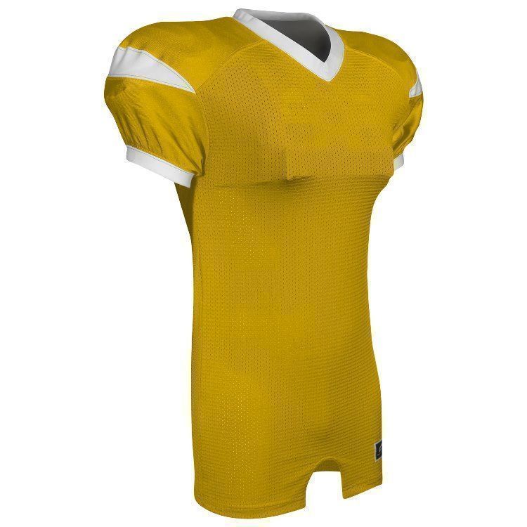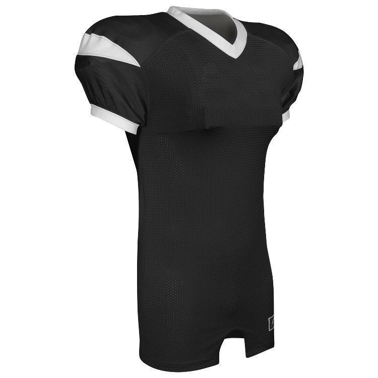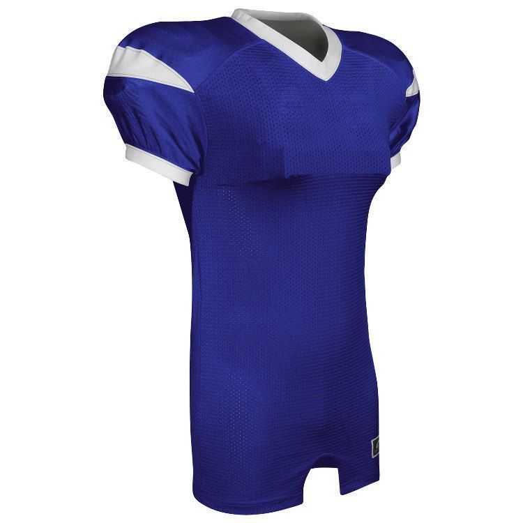 Champro FJ30 football jersey features 94% polyester / 6% spandex stretch mesh body, 100% polyester dazzle shoulders/sleeves and 13% elastane collar and cuffs for a fitted pro-style fit. Champro FJ30 jersey also features contrast shoulder inserts / sleeves / collar, double ply cowl, mitered v-neck, coverstitched seams, and a full length body cut with motion vents.