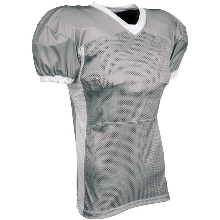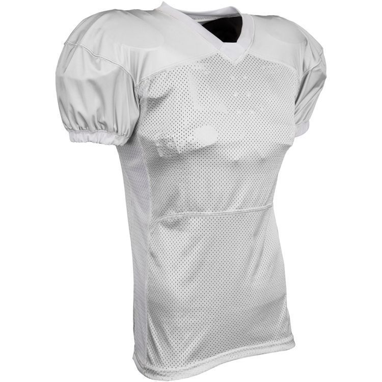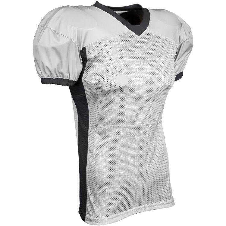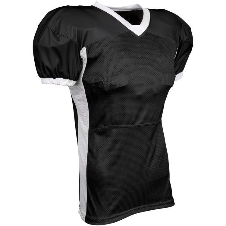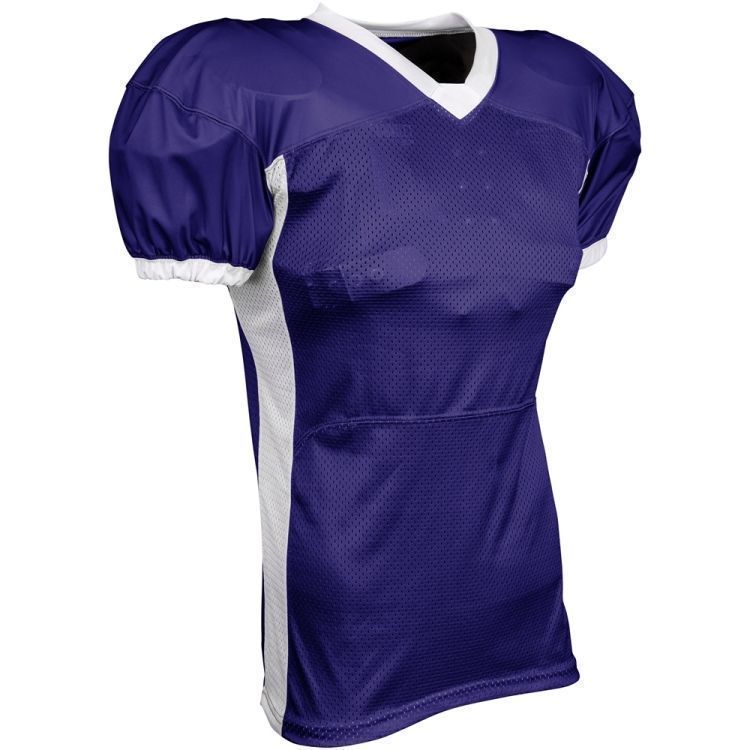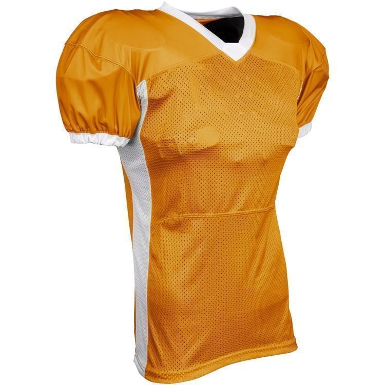 Champro FJ40 football jersey features polyester stretch mesh body, polyester dazzle shoulders and elastane collar and cuffs for a fitted pro-style fit. Champro FJ40 jersey also features contrast side stripe inserts / sleeves / collar, front waist seam, double ply cowl, v-neck with 5- sided insert, coverstitched seams, and a full length body cut with motion vents at back.
