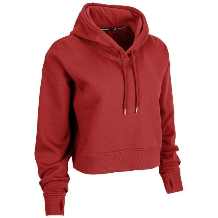 Champro VFCH1 womens hooded crop sweatshirt features 8.1oz 60% polyester / 40% cotton fleece for maximum comfort. Champro VFCH1 ladies pullover hoodie features a solid color design, hood with drawcord / metal aglets, cropped length, thumbholes in stretch rib cuffs with stretch rib bottom hem.
