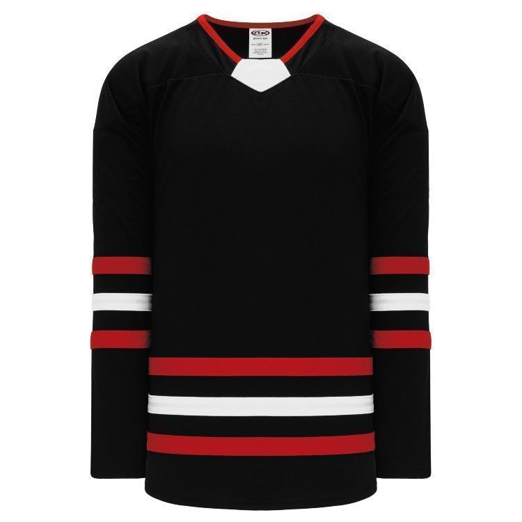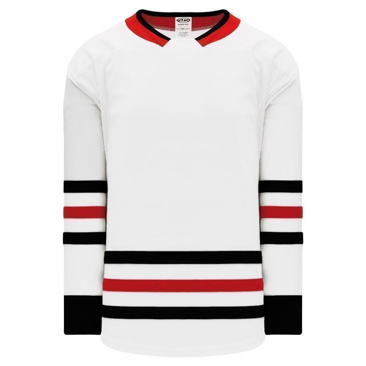 Blank Chicago Blackhawks home, away and 3rd hockey jerseys feature pro-weight AK-Knit fabric with authentic Blackhawks red, black and white striping pattern. Athletic Knit Blackhawks blank hockey jerseys also feature 2-layers of material on the shoulders / elbows, edge v-necks with trim and reinforced stitching. Buy blank or customize with screen printing or tackle twill logos, numbers and player names. Purchase youth through adult goalie cut sizes. Made in Canada.