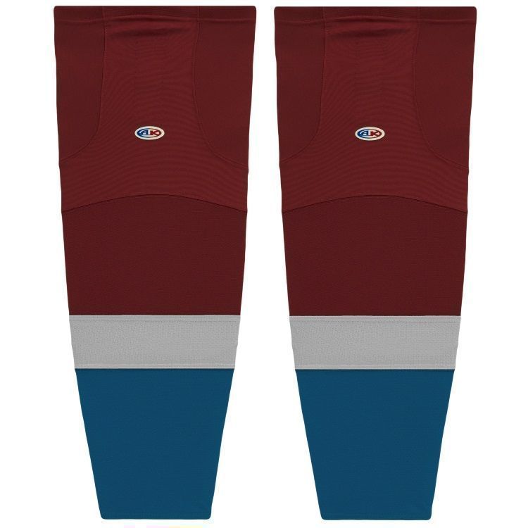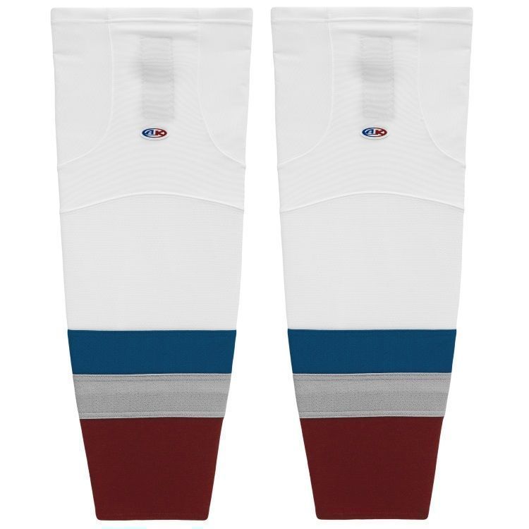 Colorado Avalanche air knit hockey socks in home and away styles. Colorado Avalanche air-knit hockey socks in stock in adult, intermediate and youth sizes in authentic Avalanche red, blue and white sewn striping. Athletic Knit HS2100 air-knit hockey socks feature pro weight edge style air knit fabric with Dry-Flex wicking stretch panels and two sewn Velcro tabs.