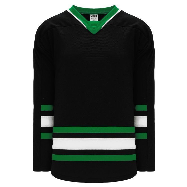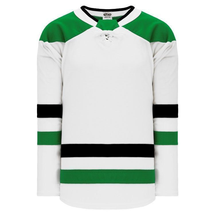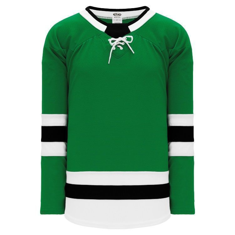 Dallas Stars blank hockey jerseys feature pro-weight AK-Knit fabric with a authentic Stars striping pattern. AK DAL823B DAL824B DAL893B home, away and 3rd blank hockey jerseys also feature 2-layers of material on the shoulders / elbows, edge lace up necks with knitted trim design and rounded bottom hem. Buy blank or customize with screen printing or tackle twill logos, numbers and player names. Purchase youth through adult goalie cut sizes. Made in Canada.