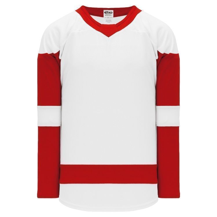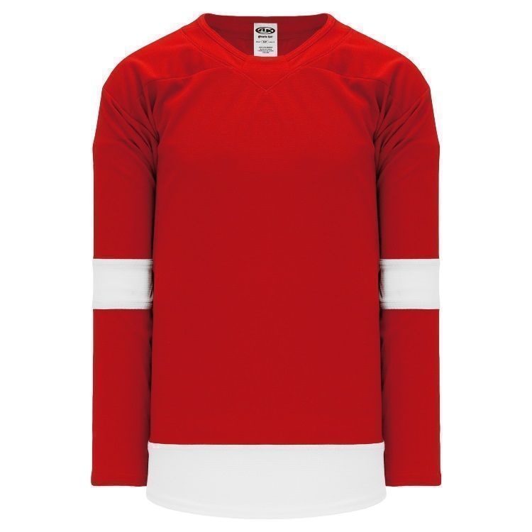Blank Detroit Red Wings home and away hockey jerseys feature pro-weight AK-Knit fabric with authentic Red Wings red and white striping pattern. Athletic Knit Red Wings blank hockey jerseys also feature 2-layers of material on the shoulders / elbows, edge v-necks with trim and reinforced stitching. Buy blank or customize with screen printing or tackle twill logos, numbers and player names. Purchase youth through adult goalie cut sizes. Made in Canada.