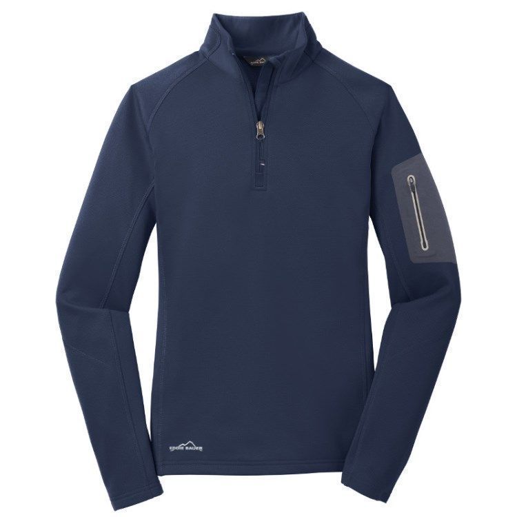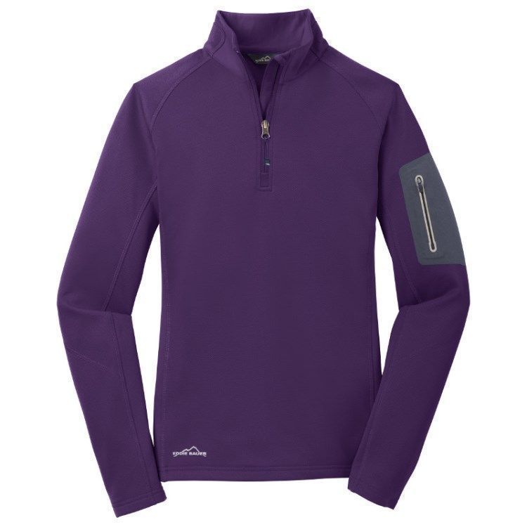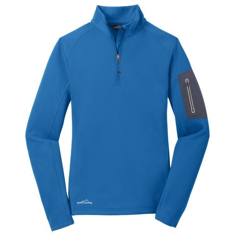Eddie Bauer EB235 1/2 zip womens pullover in a lightweight sleek design. Eddie Bauer EB235 shirt features 12.8 oz. polyester spandex smooth fleece with subtle grey print. EB235 half zip pullovers have a reverse coil zipper, welded zippered sleeve pocket, open cuffs and Eddie Bauer logo on the right hem. Request a quote with your custom team logos.