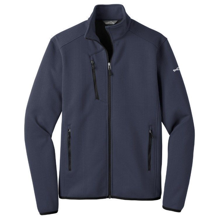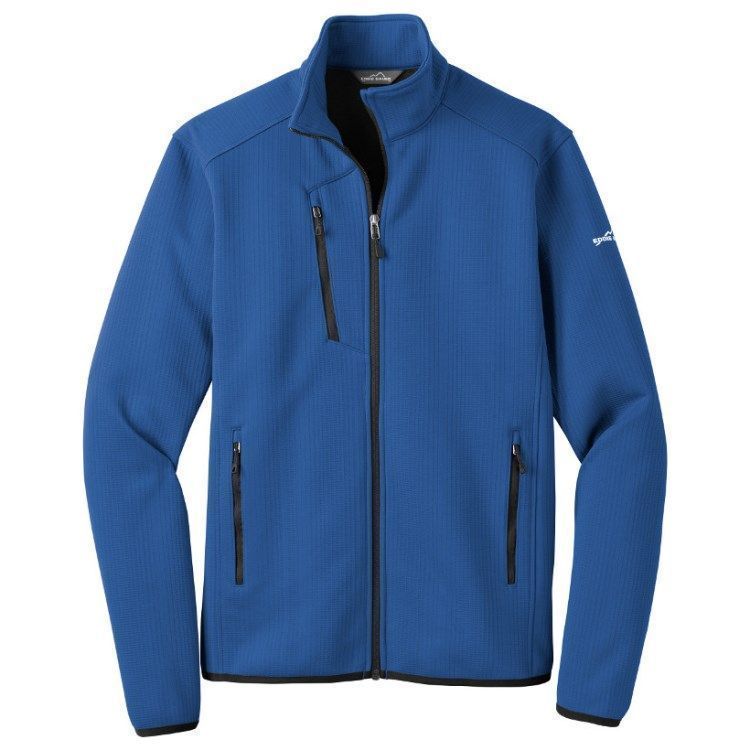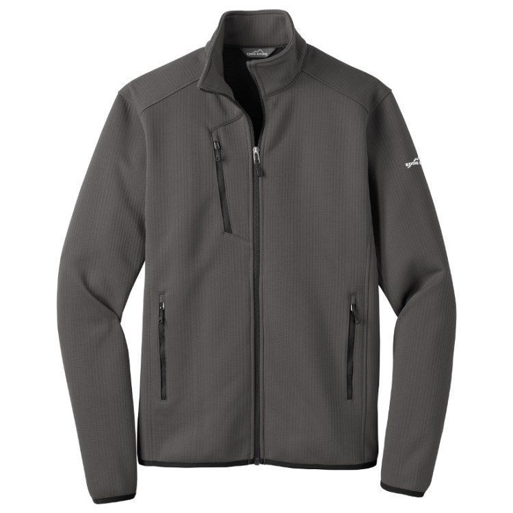 Eddie Bauer EB242 Dash mens full zip hybrid fleece jacket in a combined stretch textured and smooth fleece design. Eddie Bauer EB242 features 15.7 oz. poly knit bonded to polyester brushed back fleece with a roll-top collar, zippered chest pocket, front zippered pockets with tricot lining, stretch binding at cuffs and hem. Eddie Bauer hybrid jacket has an Eddie Bauer logo on the right hem. Request a quote with your custom team logo.