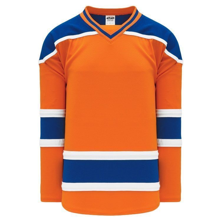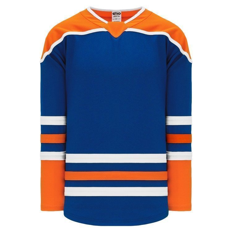 Blank Edmonton Oilers home, away and 3rd hockey jerseys feature pro-weight AK-Knit fabric with authentic Edmont Oilers striping pattern. AK EDM877B EDM878B EDM738B Oilers blank hockey jerseys also feature 2-layers of material on the shoulders / elbows, edge v-necks with inlay design and rounded bottom hems. Buy blank or customize with screen printing or tackle twill logos, numbers and player names. Purchase youth through adult goalie cut sizes. Made in Canada.