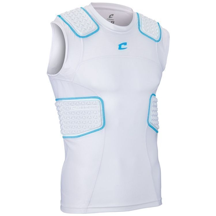polyester / 15% spandex high compression fabric with 4-way stretch and Dri-Gear wicking technology. Champro FJU35 bull rush football compression shirt also feature a sleeveless design, molded pads on sides, shoulders and back. New for 2025.
