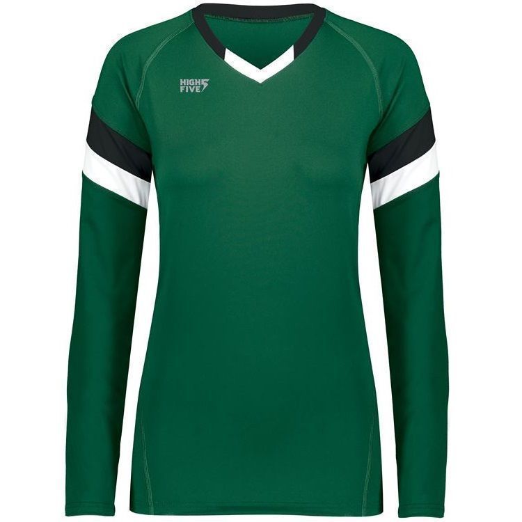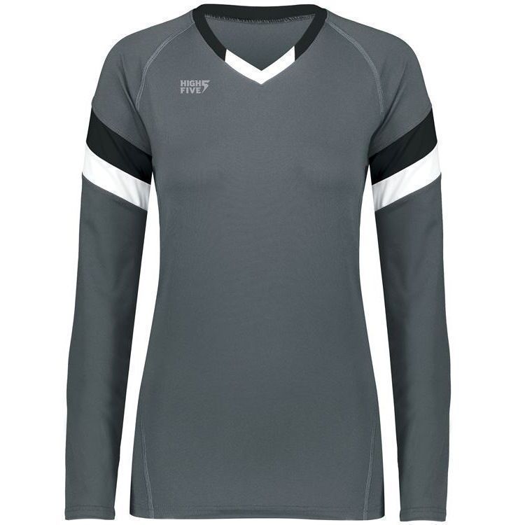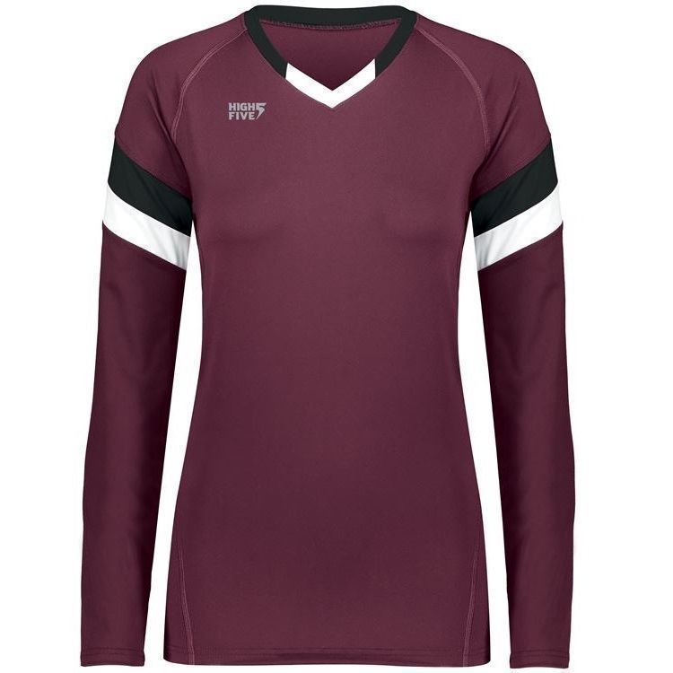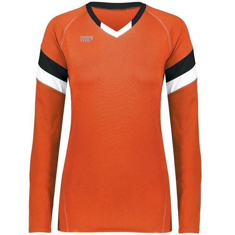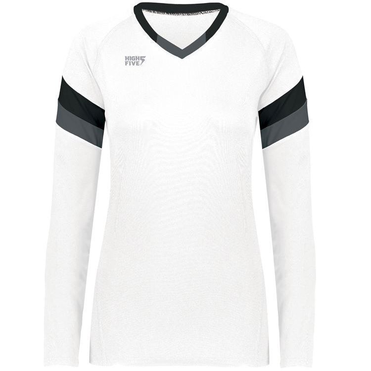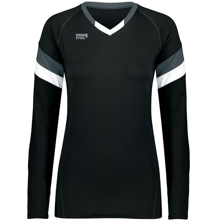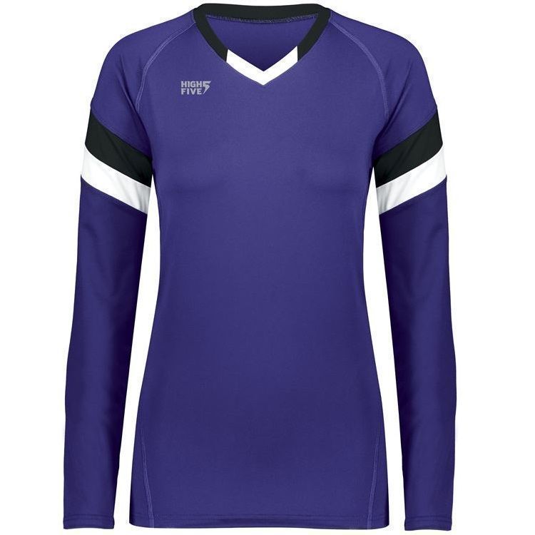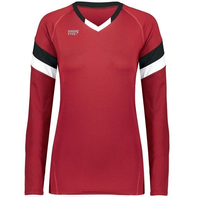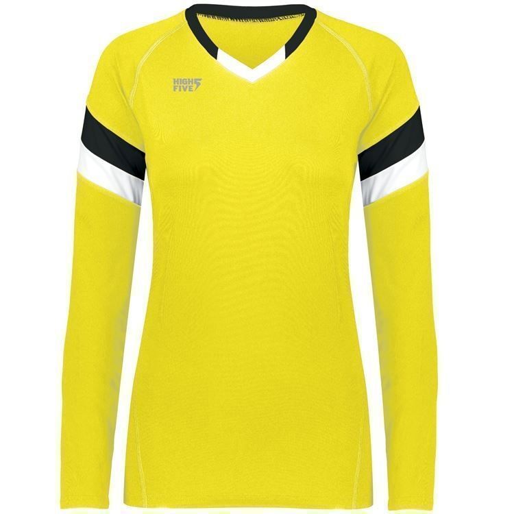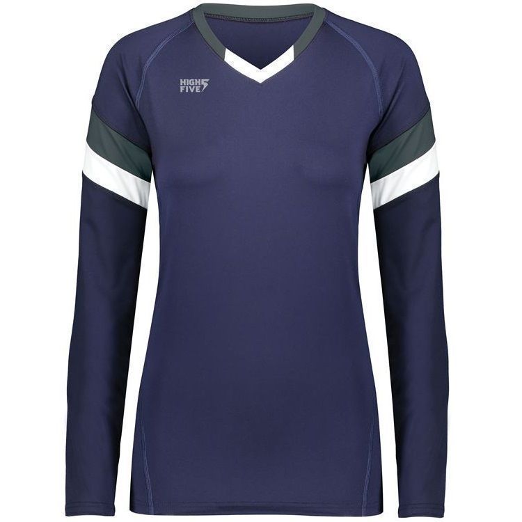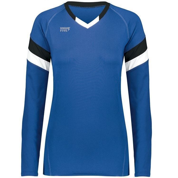 High 5 342242 TruHit Striped Long Sleeve volleyball jersey features 84% polyester / 16% spandex with 4-way stretch for maximum performance. High 5 TruHit volleyball jersey also features a fitted design, contrast color sleeve stripes, long sleeves, v-neck and a double needle hemmed bottom. This jersey was specifically designed for women's volleyball.