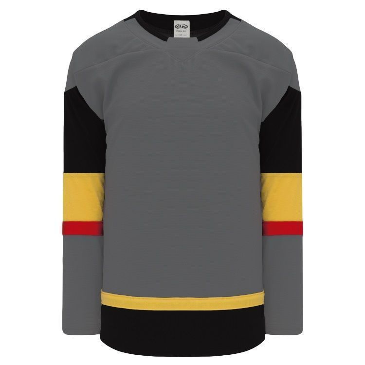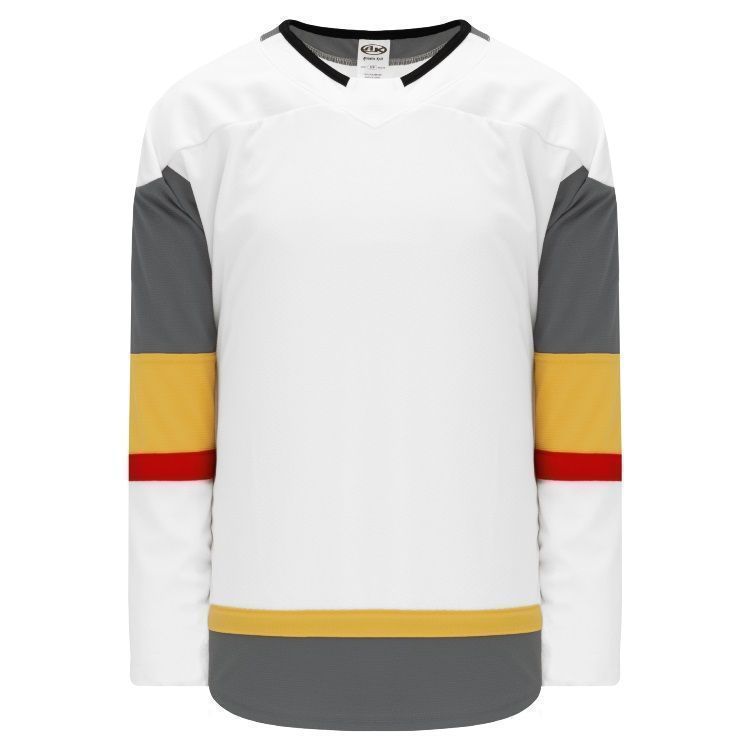 Blank Vegas Golden Knights home, away and 3rd hockey jerseys feature pro-weight AK-Knit fabric with authentic Knights charcoal grey striping pattern. AK LAV394B LAV395B LAV625B Vegas Knights blank hockey jerseys also feature 2-layers of material on the shoulders / elbows, v necks with edge trim design and rounded bottom hem. Buy blank or customize with screen printing or tackle twill logos, numbers and player names. Purchase youth through adult goalie cut sizes.