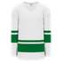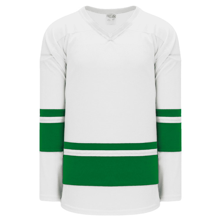 AK H6400 jersey features mid weight air knit white body with kelly sleeve and bottom hem striping. AK H6400-211 white hockey jersey also has a dual royal stripe design, a rounded bottom hem and a kelly knitted v-neck.