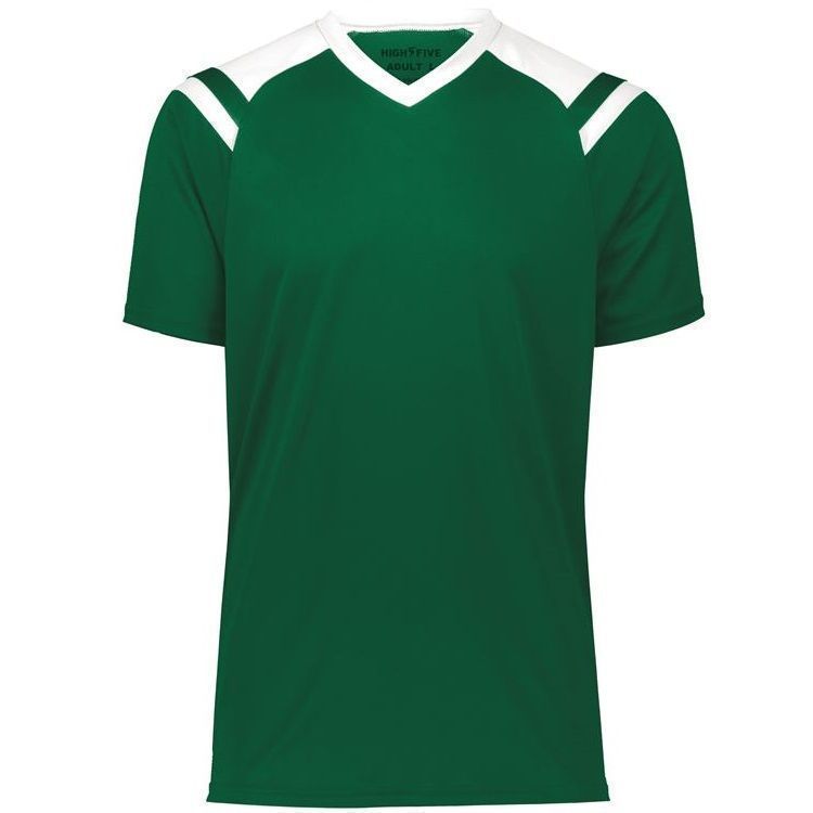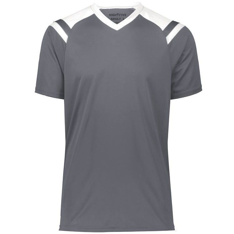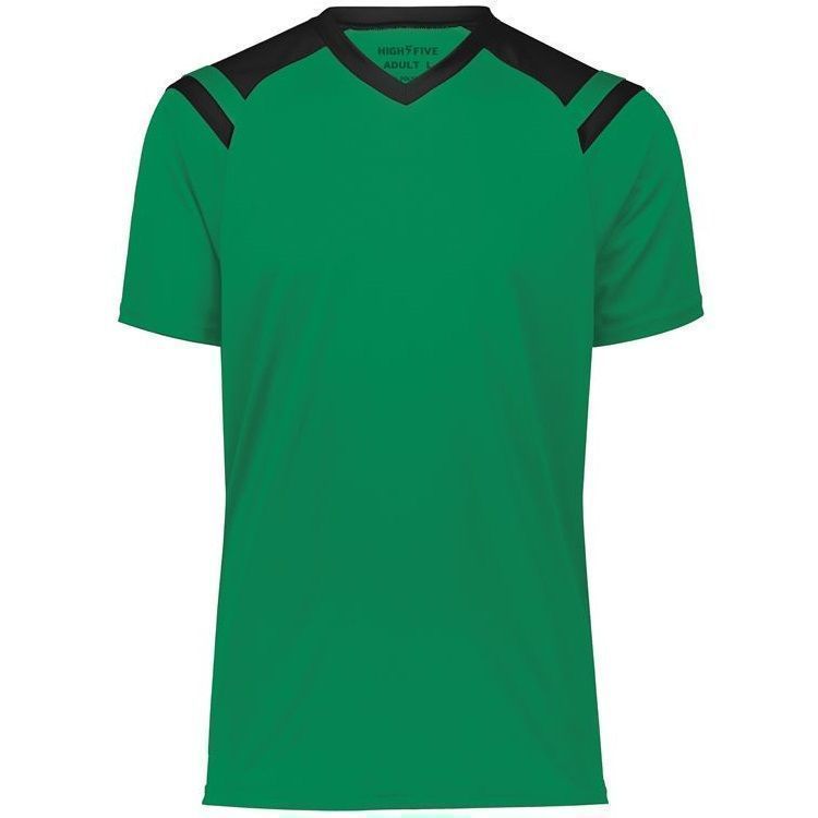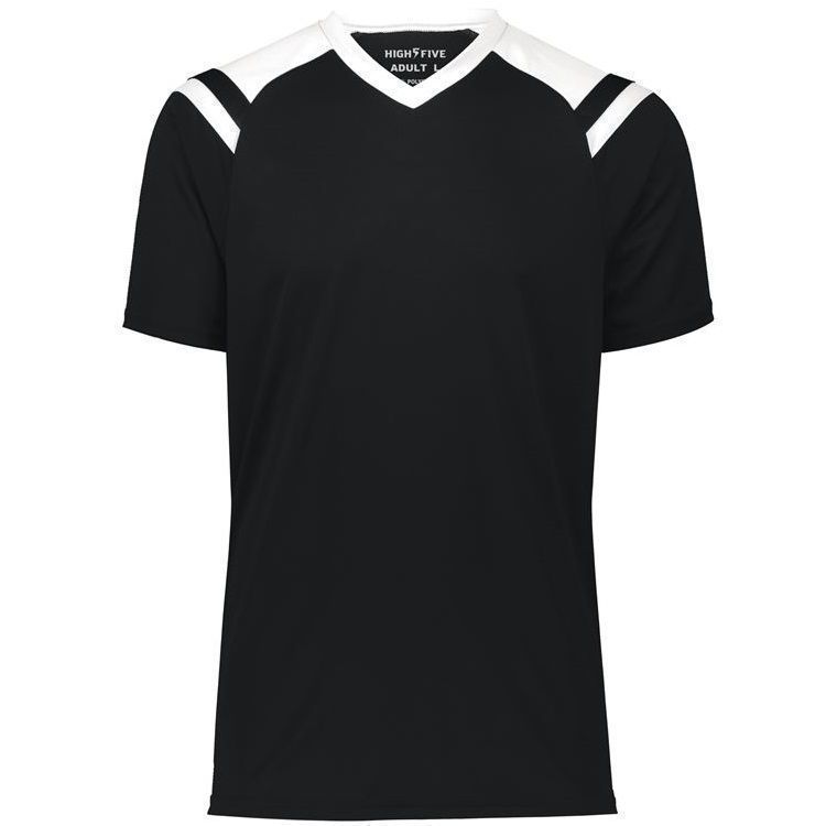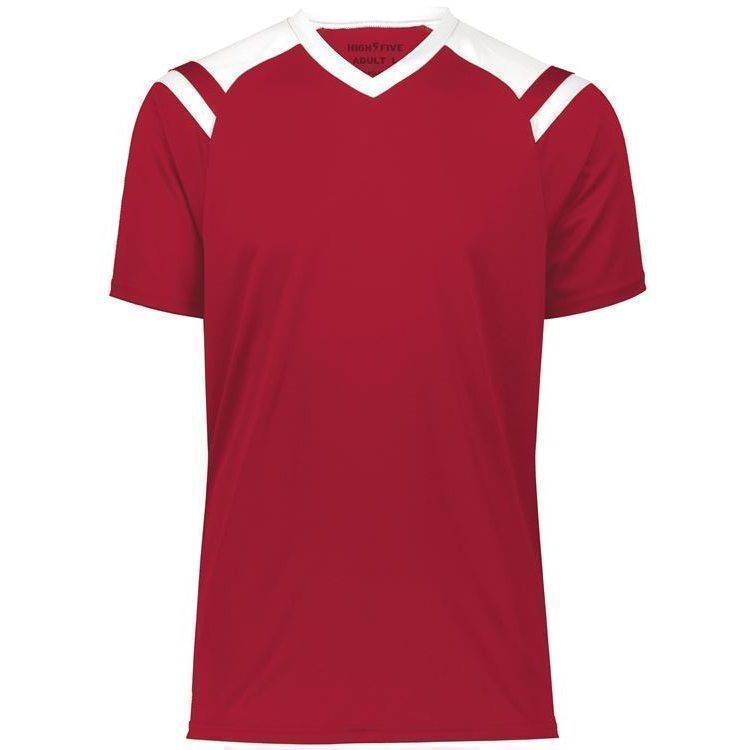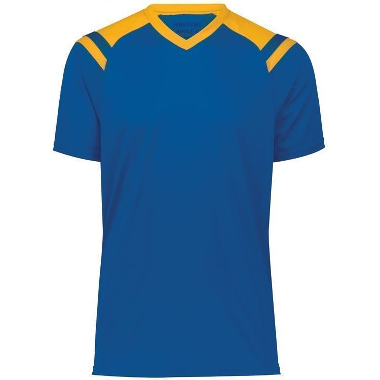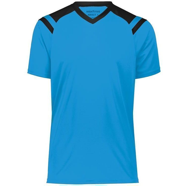 High 5 Sheffield soccer jersey is made of moisture wicking fabric with 2-color design and contrast color shoulder stripes. High Five 322970 322971 soccer jersey also features contrast neck, tag free label and raglan sleeves.