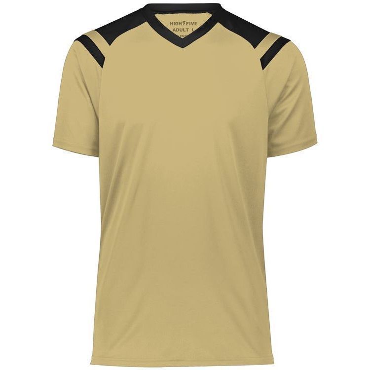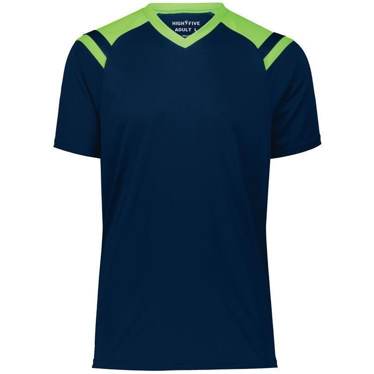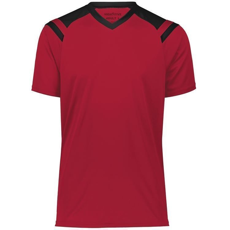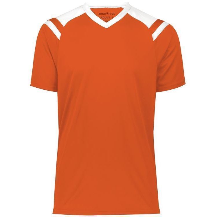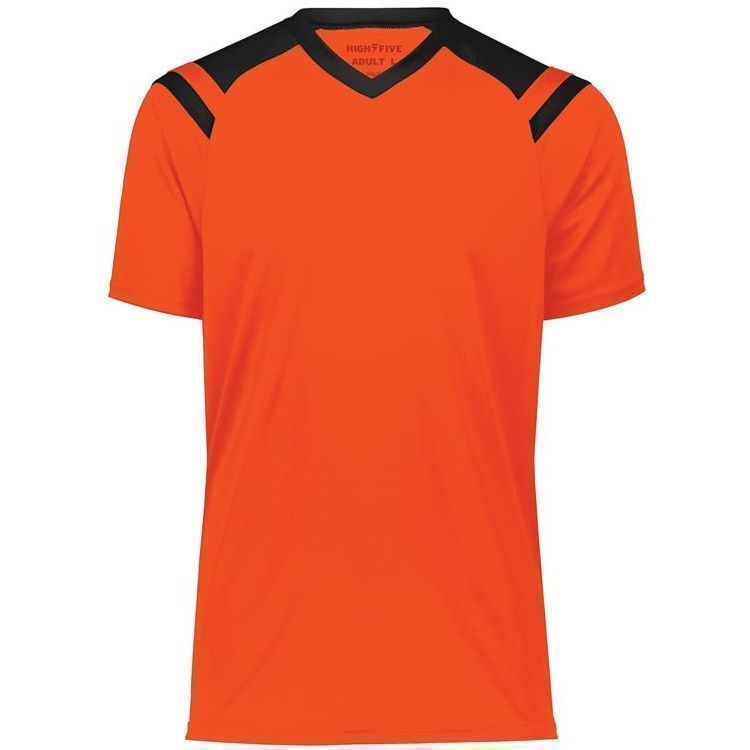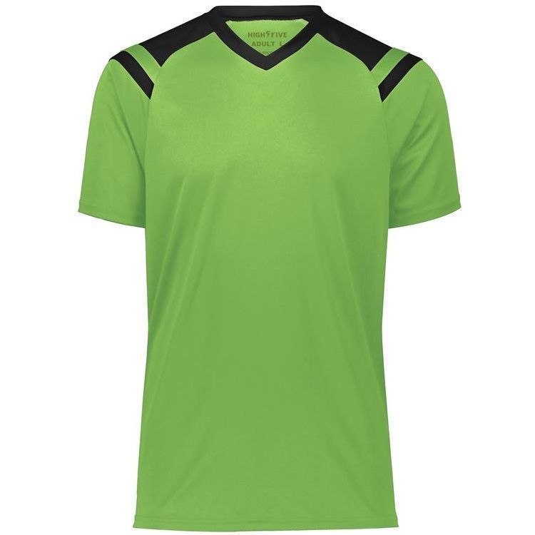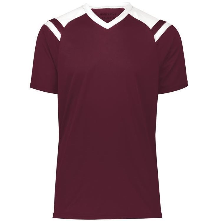High 5 Sheffield soccer jersey is made of moisture wicking fabric with 2-color design and contrast color shoulder stripes. High Five 322970 322971 soccer jersey also features contrast neck, tag free label and raglan sleeves.