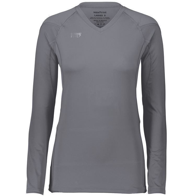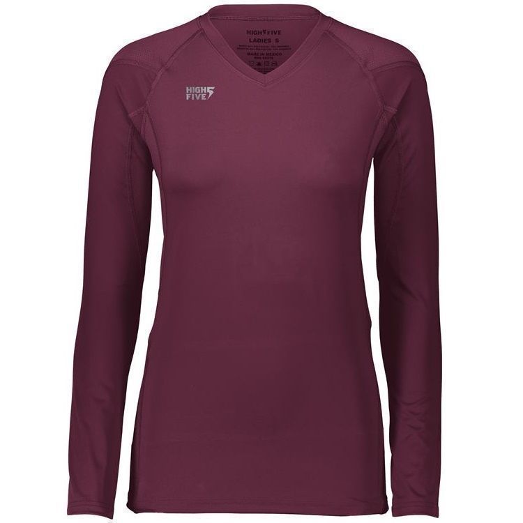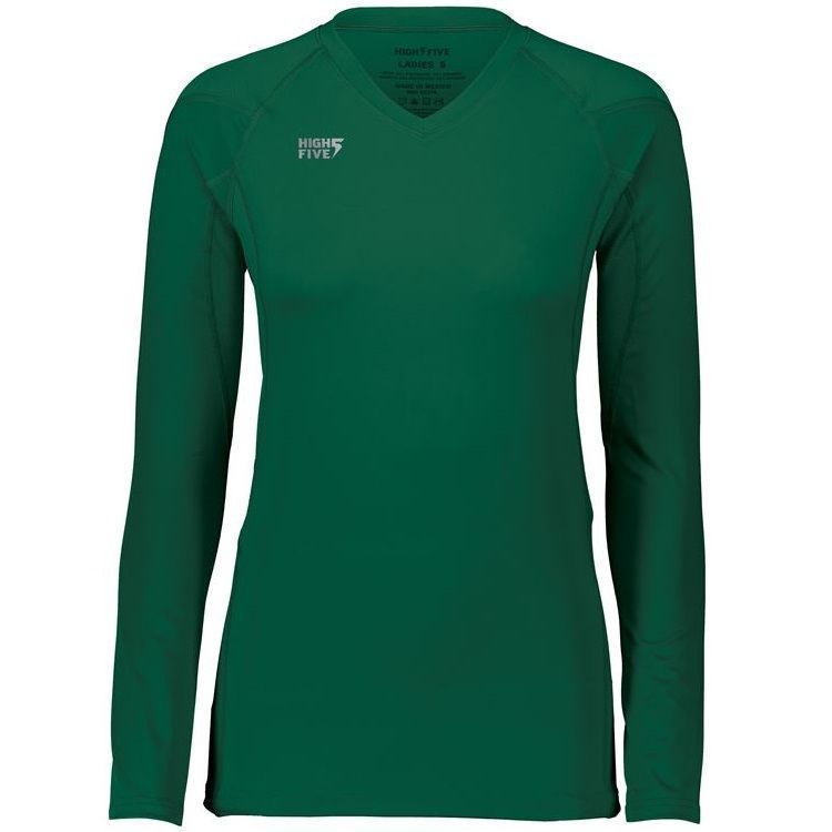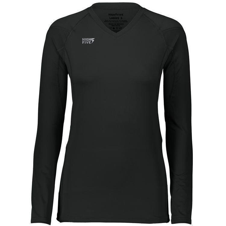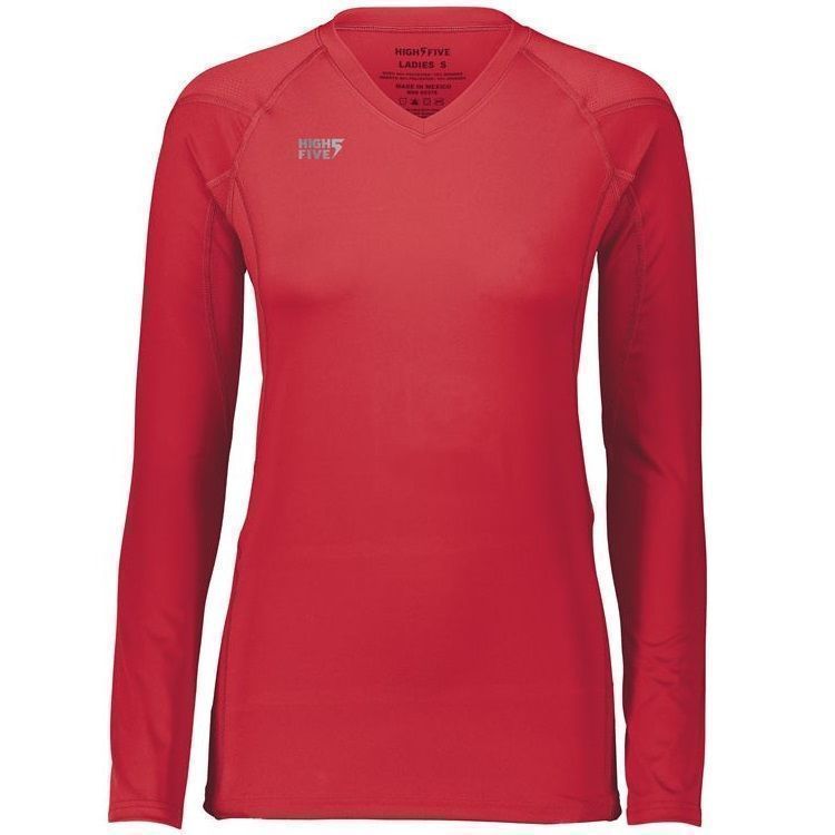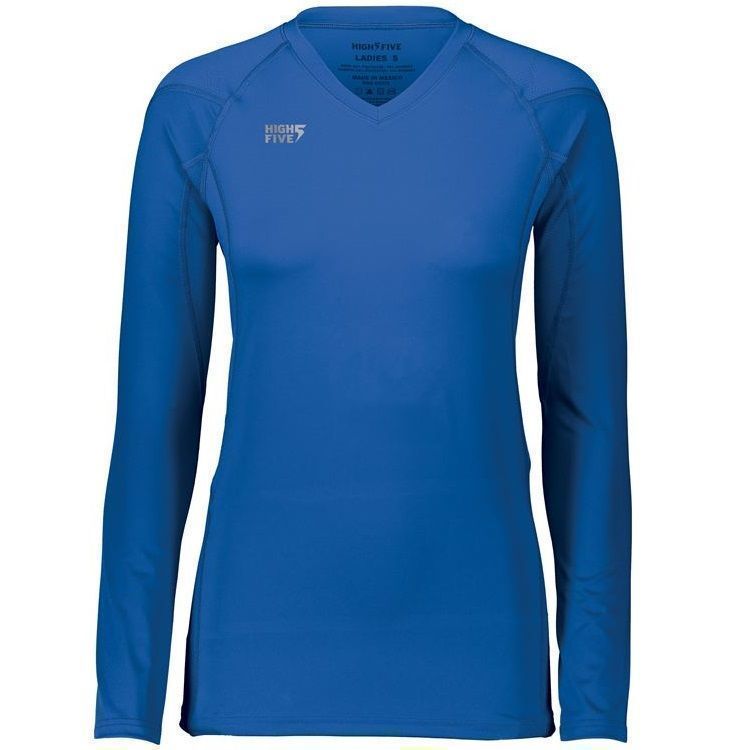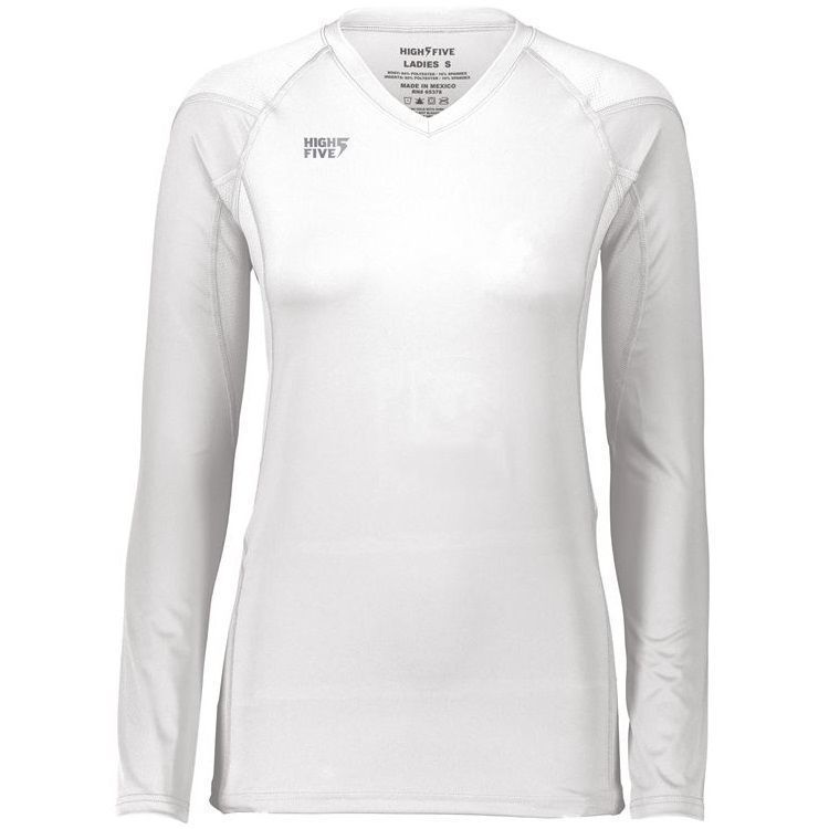 High 5 342212 TruHit Womens Long Sleeve volleyball jersey features 86% polyester / 14% spandex wicking fabric that pulls moisture away from the skin. High 5 TruHit LS volleyball jersey also features a fitted design, wicking mesh side inserts, long raglan sleeves, v-neck and a double needle hemmed bottom. This jersey was specifically designed for women's volleyball and meets NFHS standards.
