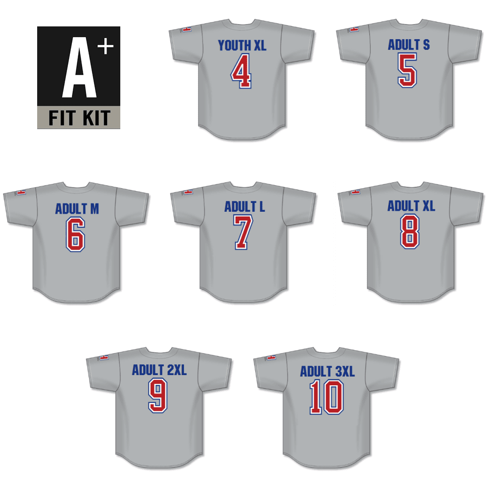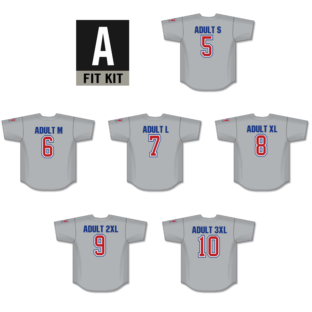 Homegrown baseball jersey fit kits for the 510S, 511C, 512C and 513C series baseball jerseys. Each kit contains (1) of each size listed. If you have a large organization you may want to consider ordering multiple kits for an easy try on / registration day.