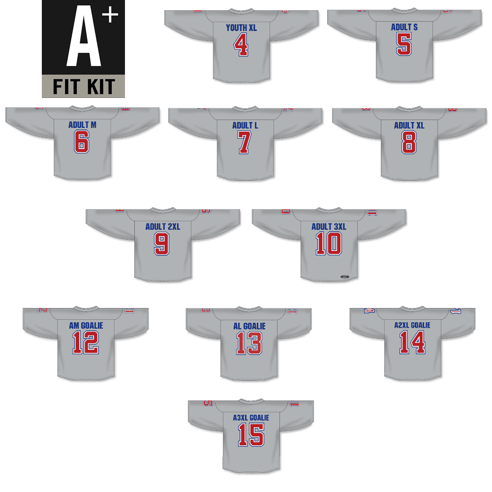 Adult Kit: (1)AS, (1)AM, (1)AL, (1)AL-Goalie, (1)AXL, (1)A2XL, (1)A2XL-Goalie, (1)A3XL & (1)A3XL-Goalie