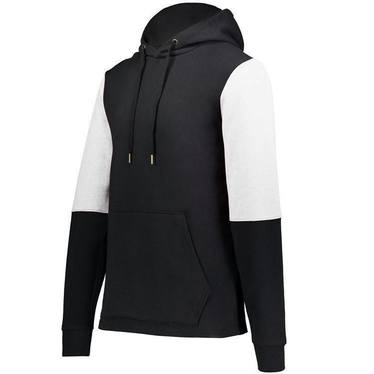 Holloway 222581 Ivy League Team Hoodie features 7.6 oz 55% polyester / 41% cotton / 4% rayon fleece with a super soft feel. Holloway 222581 hoodie also features a 2-color design, jersey lined hood with metal tipped drawcord (adult only), front pouch pocket, set-in sleeves, spandex blend rib-knit cuffs, exterior faux leather logo loop label, open bottom hem with a drop tail.
