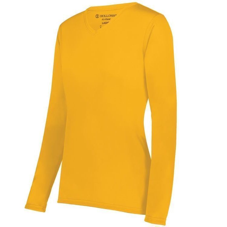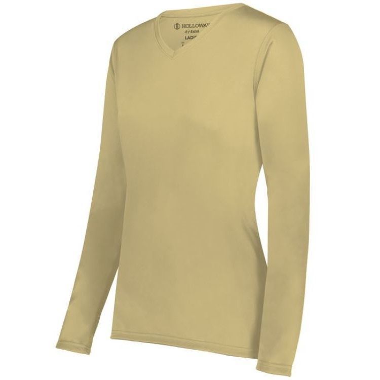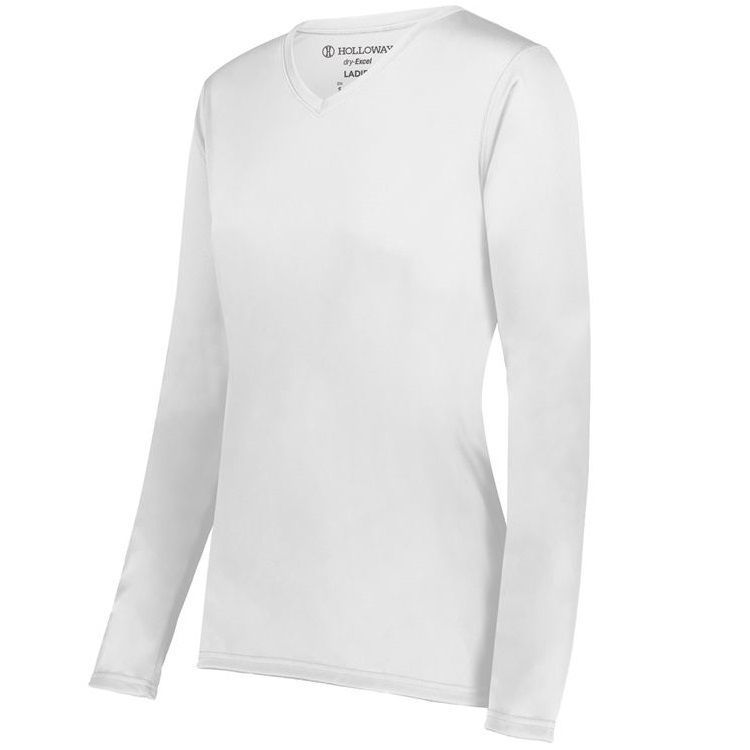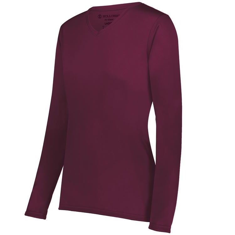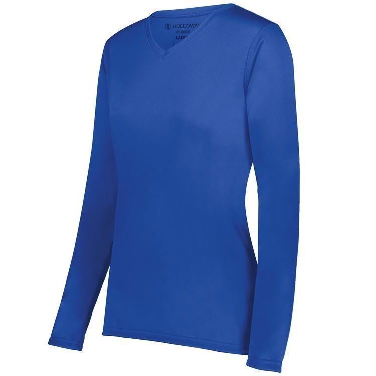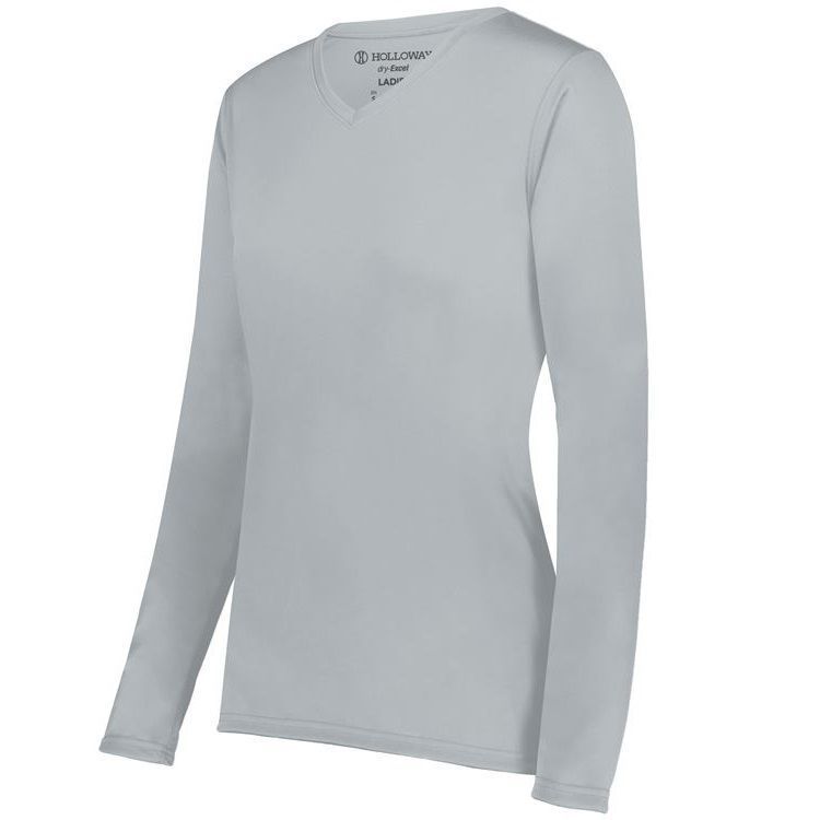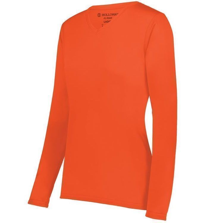 Holloway 222824 Momentum Womens LS Tee features 100% polyester interlock wicking fabric with antimicrobial finish for no odor. Holloway long sleeve tee shirt also features 30+ UPF sun protection, v-neck design and set in sleeves. Also features tagless heat seal size label.