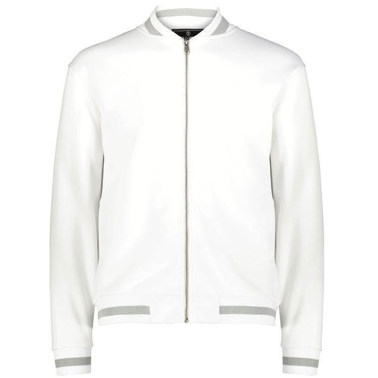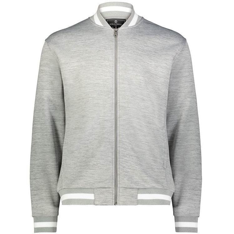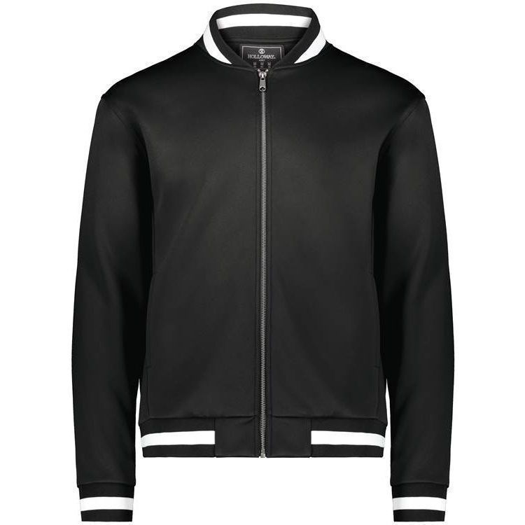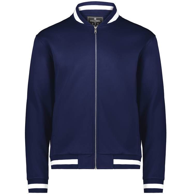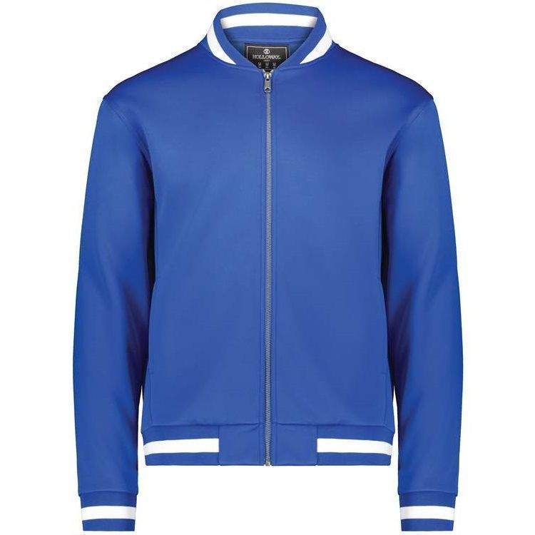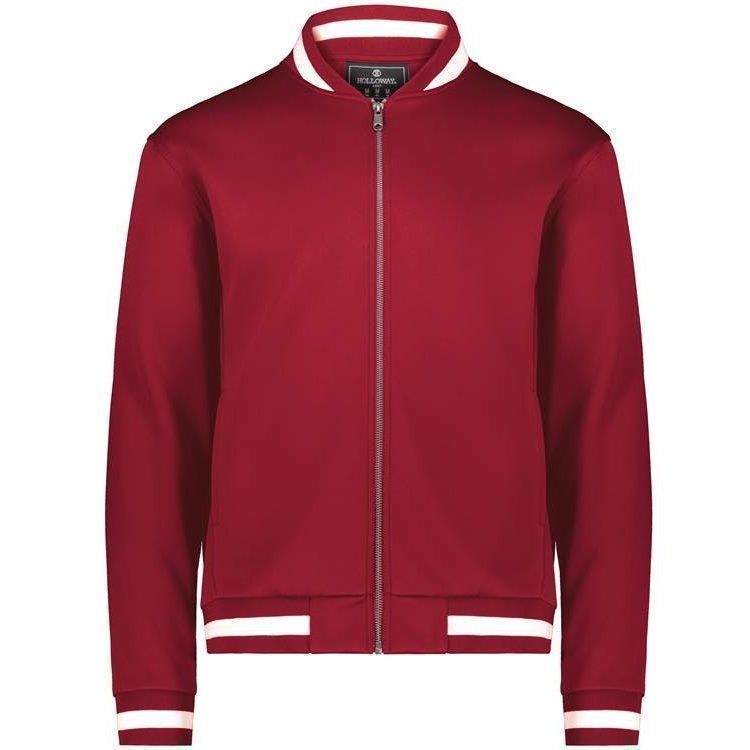 Holloway 223547 V-Street Full Zip Jacket features a 100% double knit fabric with a classic varsity styling in a modern feel and look. Holloway 223547 jacket also features a full zip front, raglan sleeves, front pockets, dual inside pockets and striped knit collar cuffs and bottom.