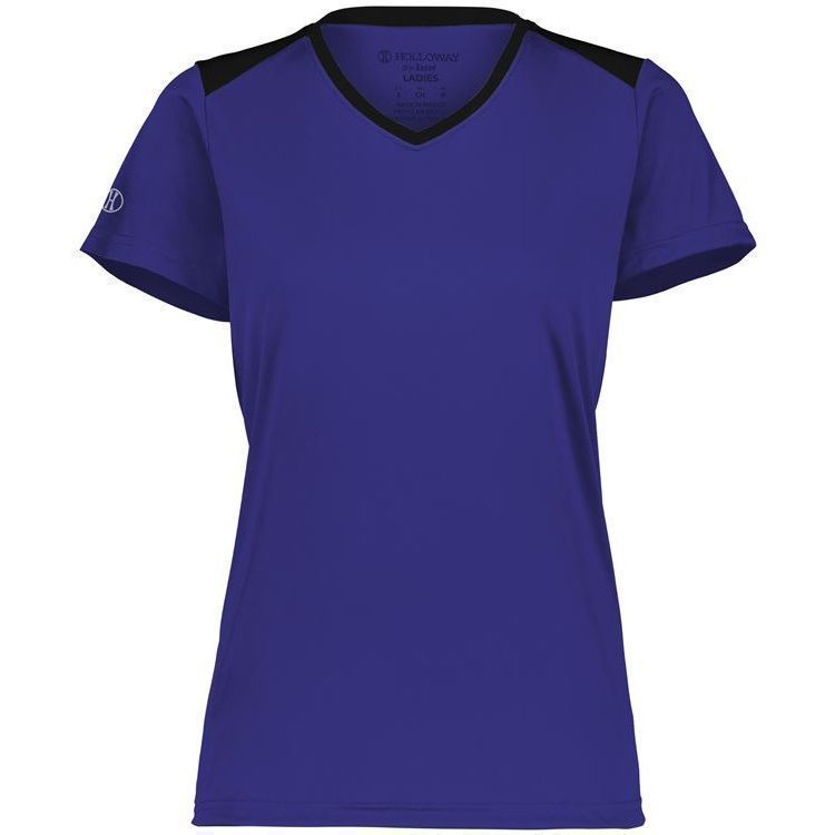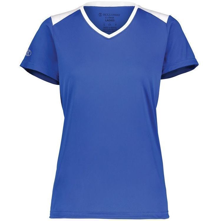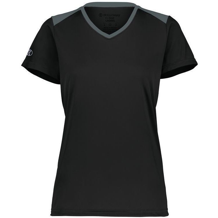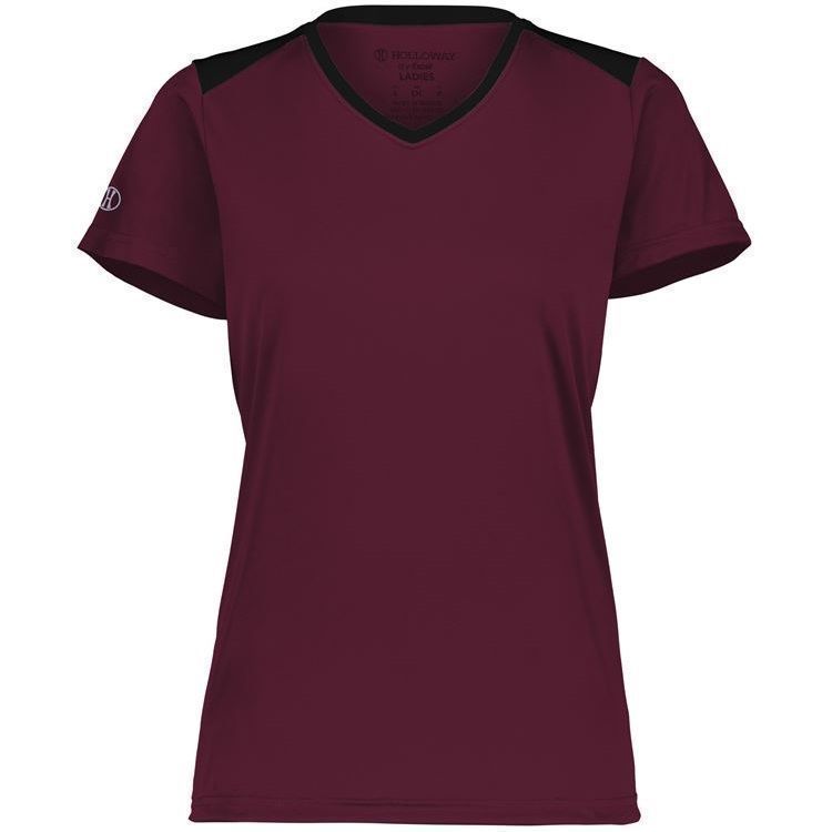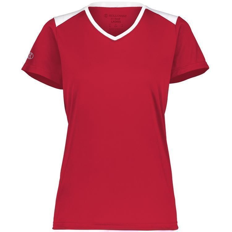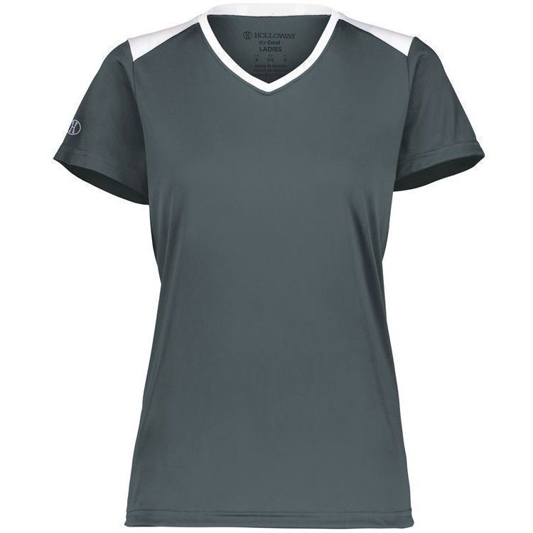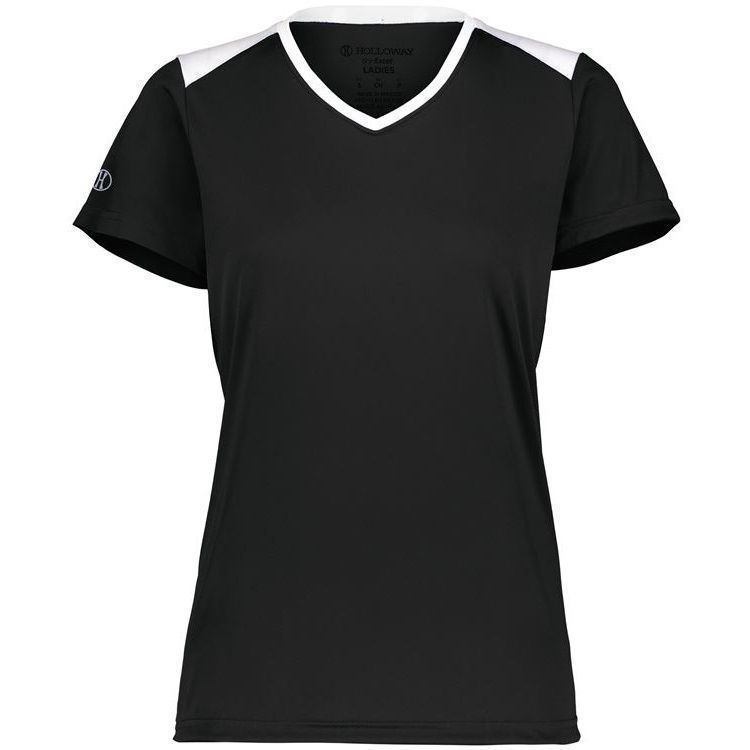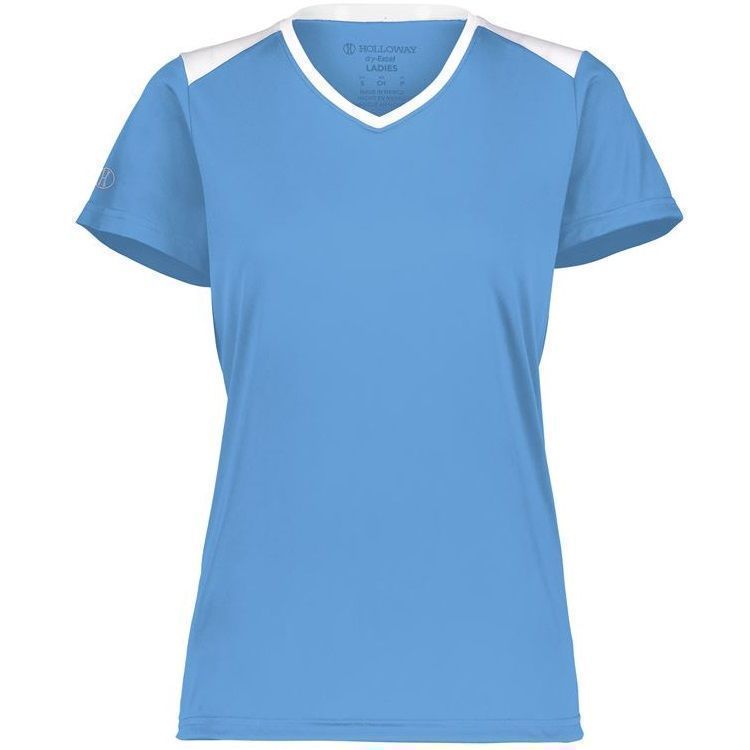 Holloway 223701 Momentum Womens SS V-Neck Jersey features 100% polyester interlock wicking fabric with antimicrobial finish for no odor. Holloway ladies short sleeve crew shirt also features 30+ UPF sun protection, contrast top shoulders, set in sleeves and self fabric crew neck collar. Also features tagless heat seal size label.