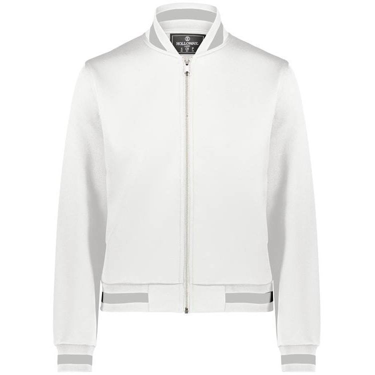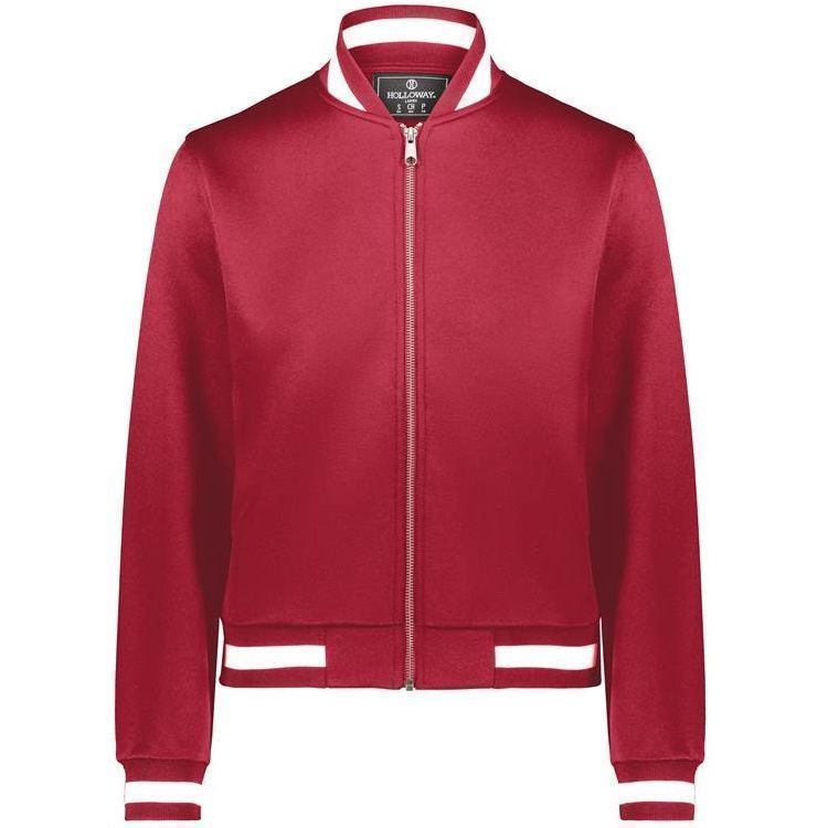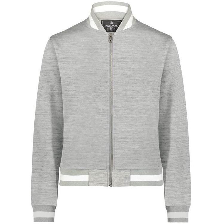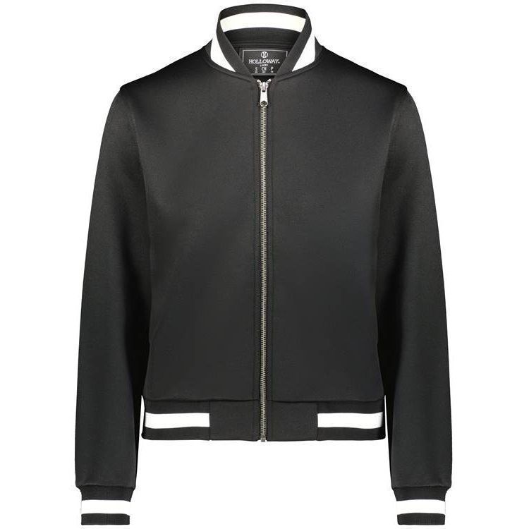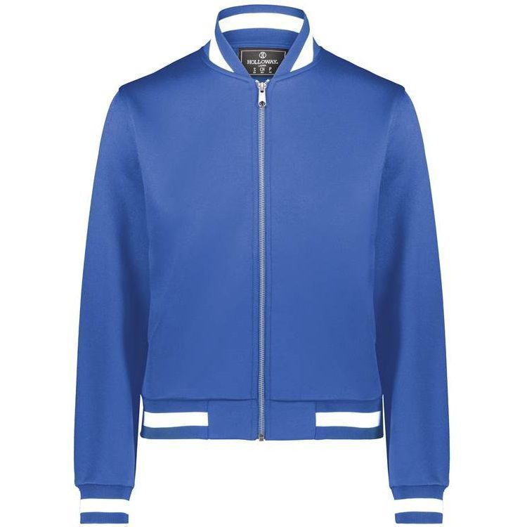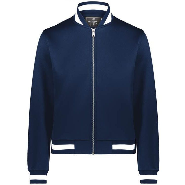 Holloway 223747 Womens V-Street Full Zip Jacket features a 100% double knit fabric with a classic varsity styling in a modern feel and look. Holloway 223747 ladies jacket also features a full zip front, raglan sleeves, front pockets, dual inside pockets and striped knit collar cuffs and bottom.