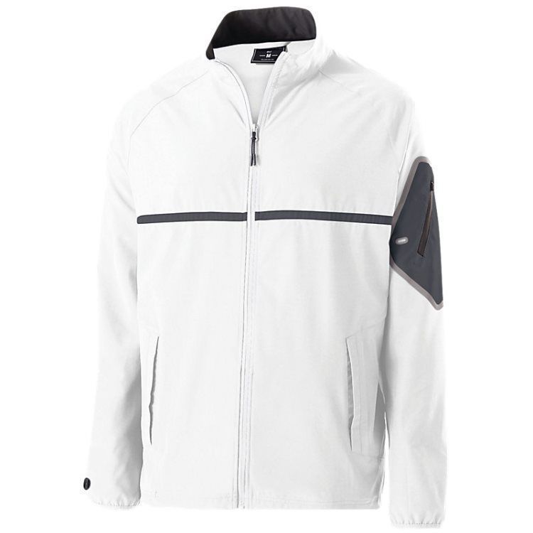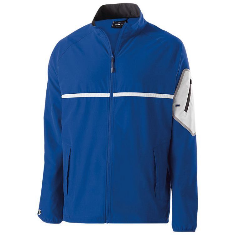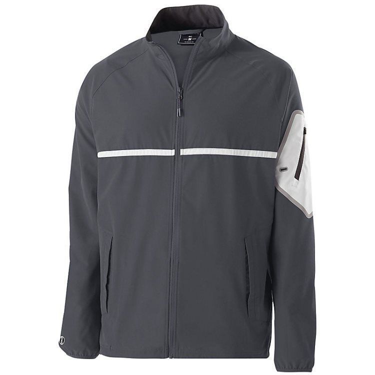 Holloway 229543 Weld Wind Jacket features water resistant woven poly-spandex fabric with 4-way stretch. The Holloway 229543 Weld jacket also features a contrast color front/back stripe, full zip front, reflective zipper pull, front welt pockets, dual inside pockets, left sleeve pocket with audio port & zipper, and partially elasticized cuffs, open bottom with hidden drawcord.