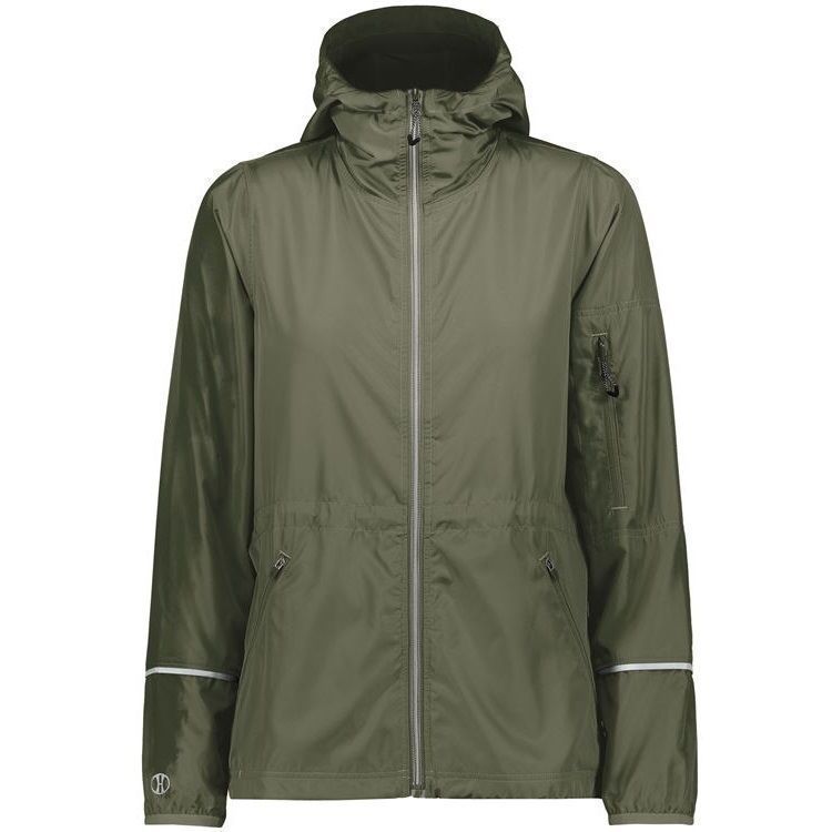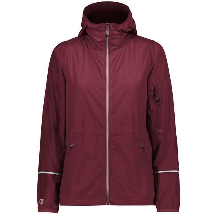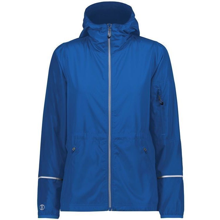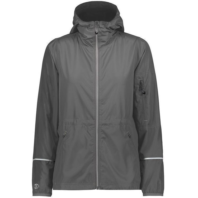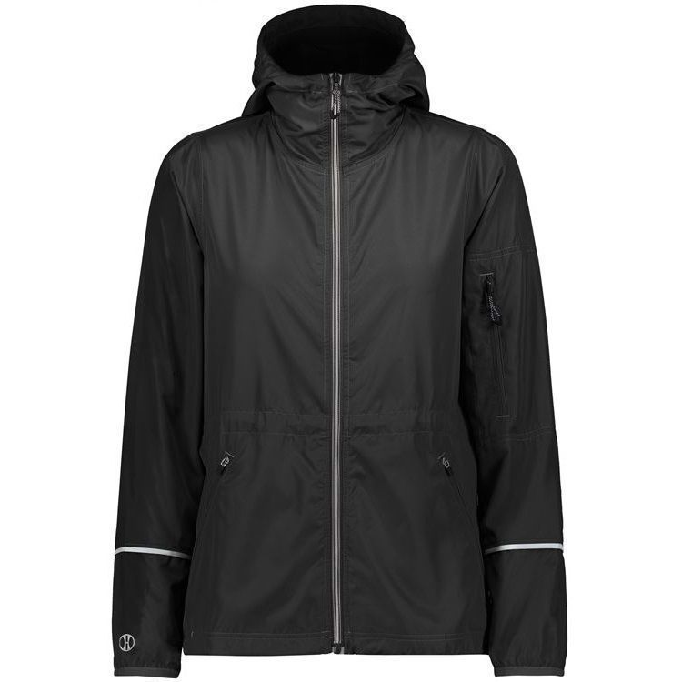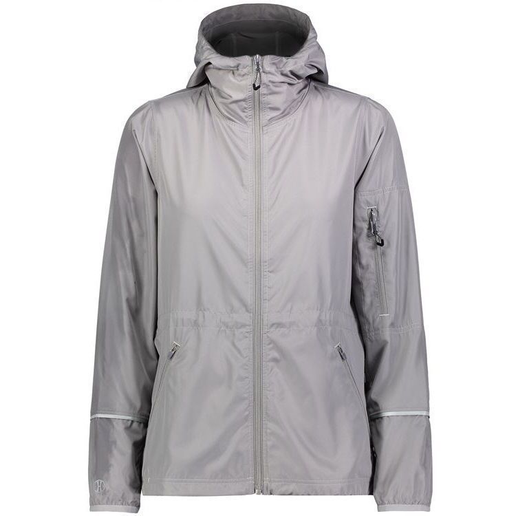 Holloway 229782 Womens Packable Hooded Jacket features a 100% micron polyester outer shell that's water and wind resistant. Holloway 229782 ladies jacket has an adjustable hood with inside concealed cord locks, a reflective trim, and back vent with adjustable closure. Spandex bound cuffs and an adjustable bottom shock-cord closure make sure you keep the warmth in and the rain out.