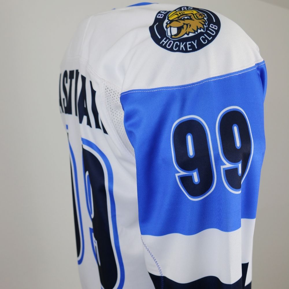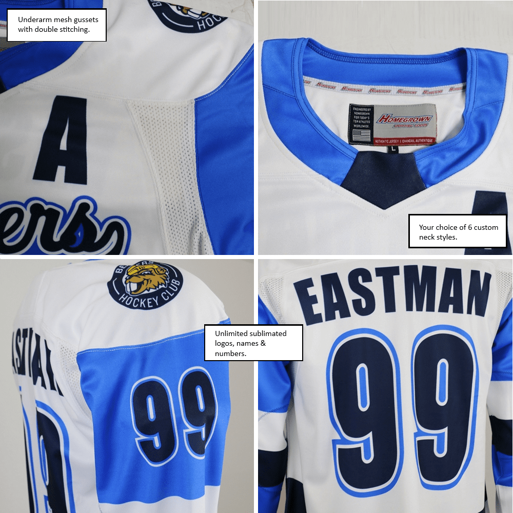 Homegrown 590S hockey jersey sublimated colors, logos, player name & numbers are all included for a set price. These jerseys offer the sublimated printing in a premium level custom jersey.
