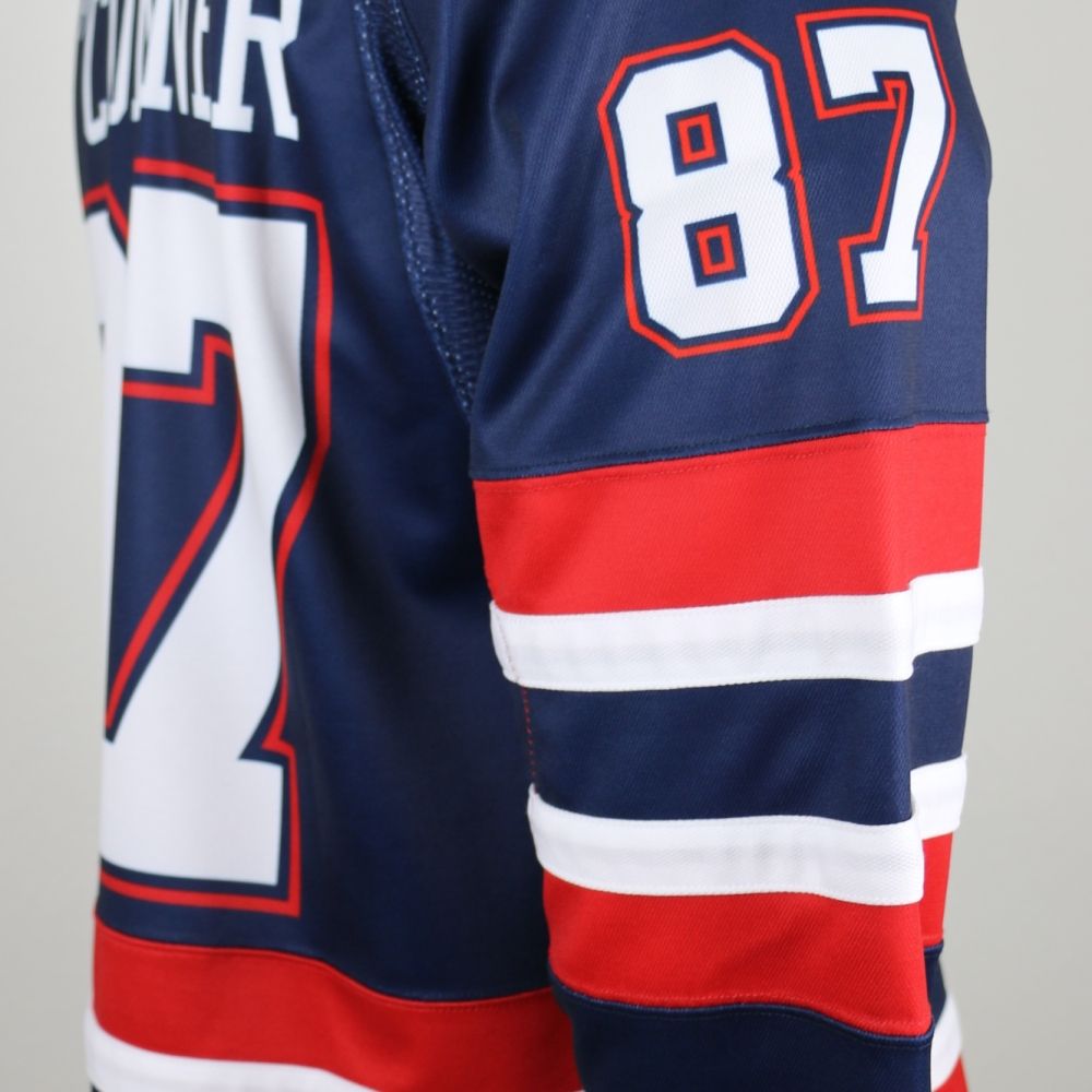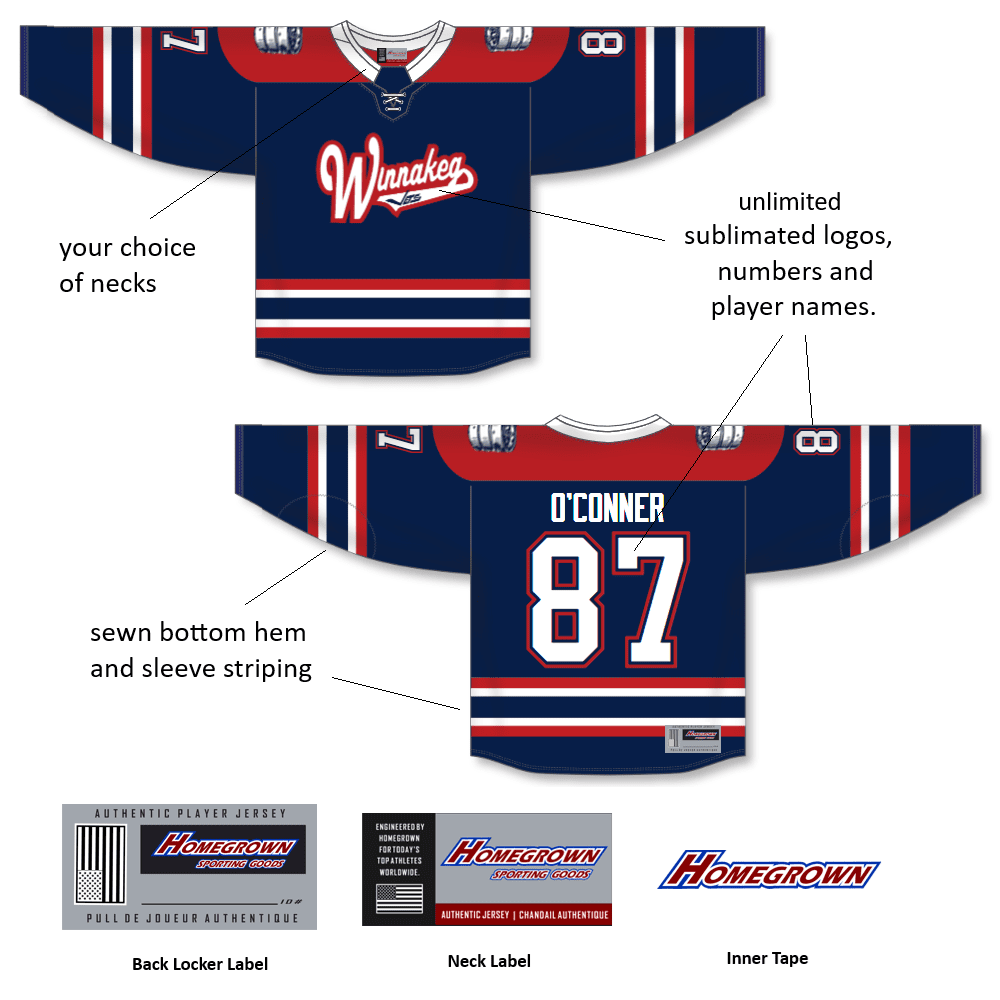 Homegrown 591S hockey jersey sublimated colors, tlogos, player name & numbers are all included for a set price. These jerseys offer the simplication of sublimated printing but with sewn raised trim striping for a one of a kind look.