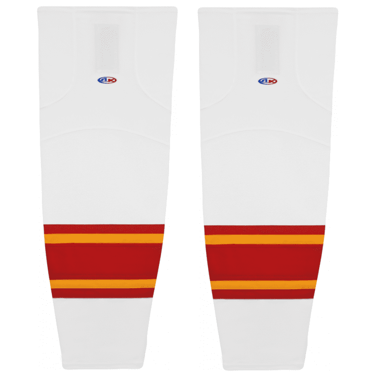 Calgary Flames air knit hockey socks in white style. Calgary Flames air-knit hockey socks in stock in adult, intermediate and youth sizes in authentic Flames white, red & gold sewn striping. Athletic Knit HS2100 air-knit hockey socks feature pro weight edge style air knit fabric with Dry-Flex wicking stretch panels and two sewn Velcro tabs.