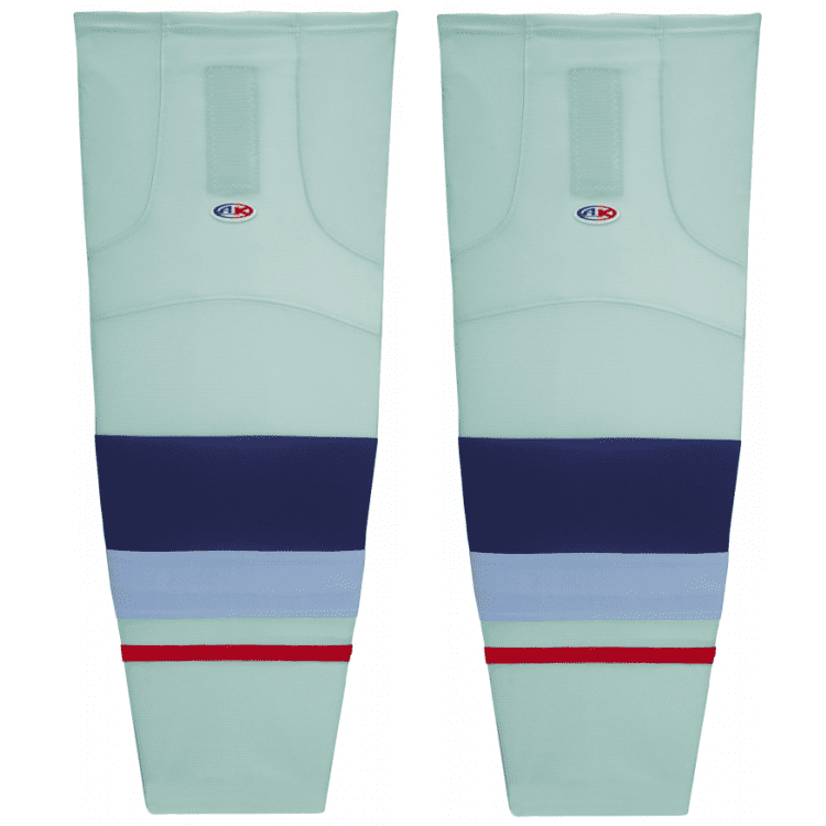 Seattle Kraken air knit hockey socks in new home, away and 3rd ice blue patterns. Kraken air-knit hockey socks in stock in adult, intermediate and youth sizes in blue, red and white striping. Athletic Knit HS2100 air-knit hockey socks feature pro weight edge style air knit fabric with Dry-Flex wicking stretch panels and two sewn Velcro tabs.