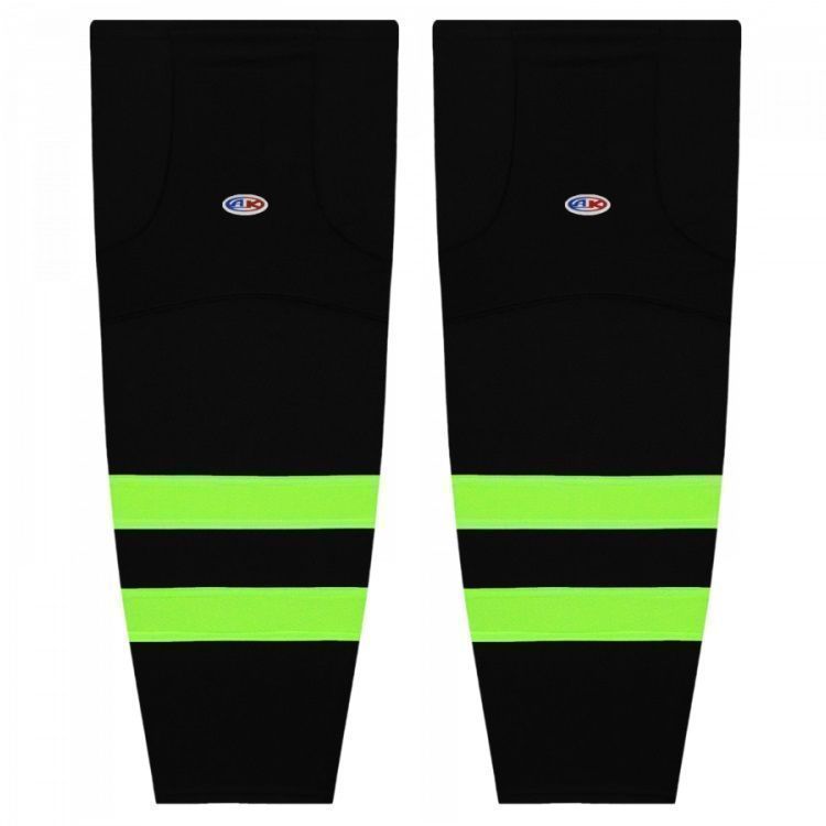 Dallas Stars air knit hockey socks in blackout neon green pattern. Stars Blackout air-knit hockey socks in stock in adult, intermediate and youth sizes in black and neon green striping. Athletic Knit HS2100 air-knit hockey socks feature pro weight edge style air knit fabric with Dry-Flex wicking stretch panels and two sewn Velcro tabs.