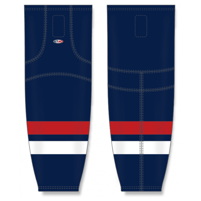 Team USA air knit hockey socks in current team colors. USA air-knit hockey socks in stock in adult, intermediate and youth sizes in authentic red, white and blue sewn striping. Athletic Knit HS2100-980 air-knit hockey socks feature pro weight edge style air knit fabric with Dry-Flex wicking stretch panels and two sewn Velcro tabs.