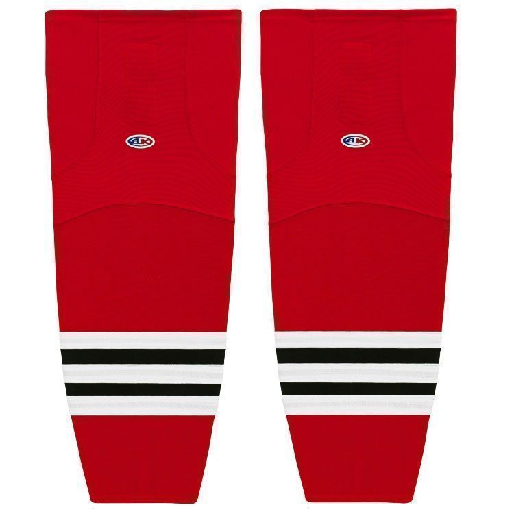 Chicago Blackhawks air knit hockey socks in home, away and 3rd styles. Chicago Blackhawks air-knit hockey socks in stock in adult, intermediate and youth sizes in authentic Blackhawks red, black and white sewn striping. Athletic Knit HS2100 air-knit hockey socks feature pro weight edge style air knit fabric with Dry-Flex wicking stretch panels and two sewn Velcro tabs.