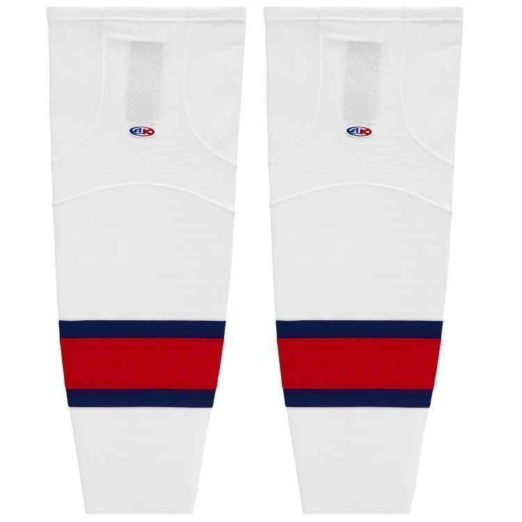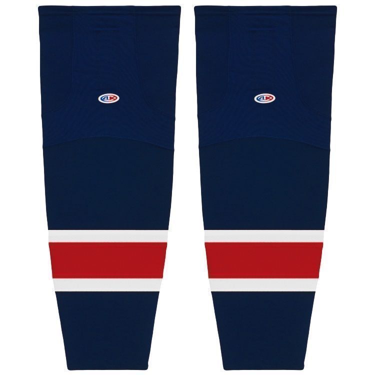 Columbus Blue Jackets air knit hockey socks in old home, and away styles. Columbus Blue Jackets air-knit hockey socks in stock in adult, intermediate and youth sizes in authentic Bluejackets red, white and blue sewn striping. Athletic Knit HS2100 air-knit hockey socks feature pro weight edge style air knit fabric with Dry-Flex wicking stretch panels and two sewn Velcro tabs.