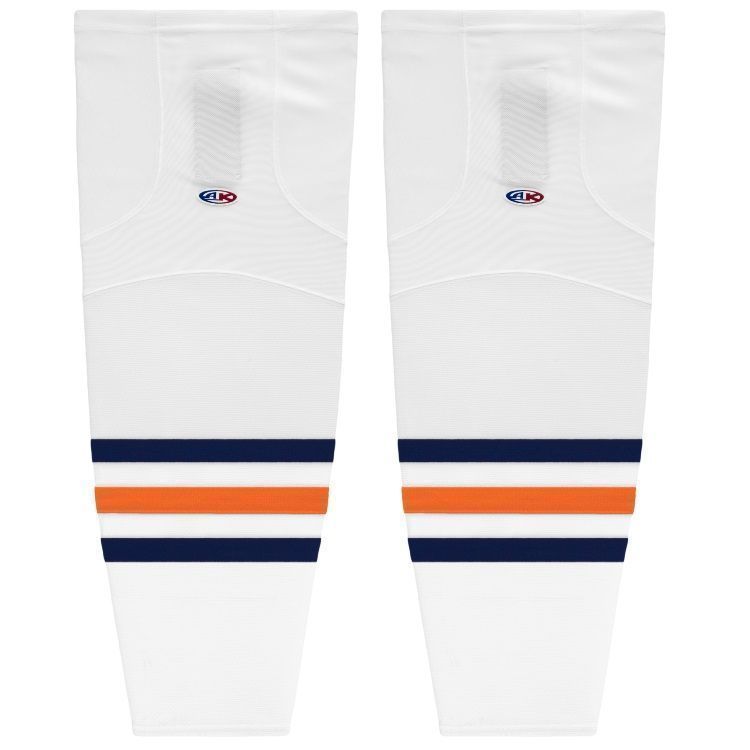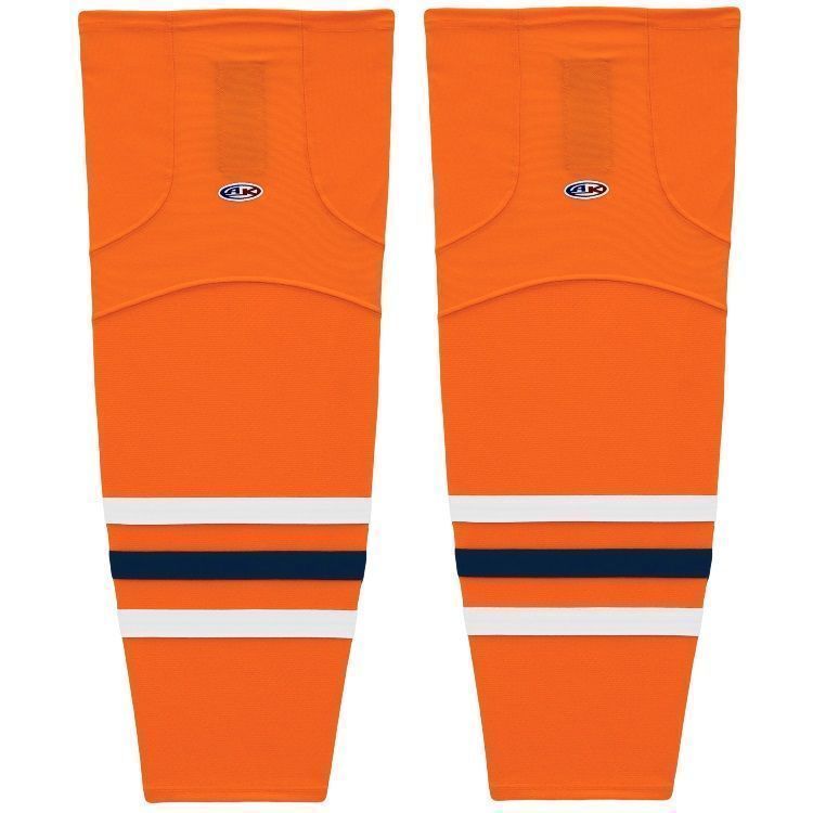 Edmonton Oilers air knit hockey socks in home and away orange. Edmonton Oilers air-knit hockey socks in stock in adult, intermediate and youth sizes in authentic 2017-18 Edmonton orange and navy sewn striping. Athletic Knit HS2100 air-knit hockey socks feature pro weight edge style air knit fabric with Dry-Flex wicking stretch panels and two sewn Velcro tabs.
