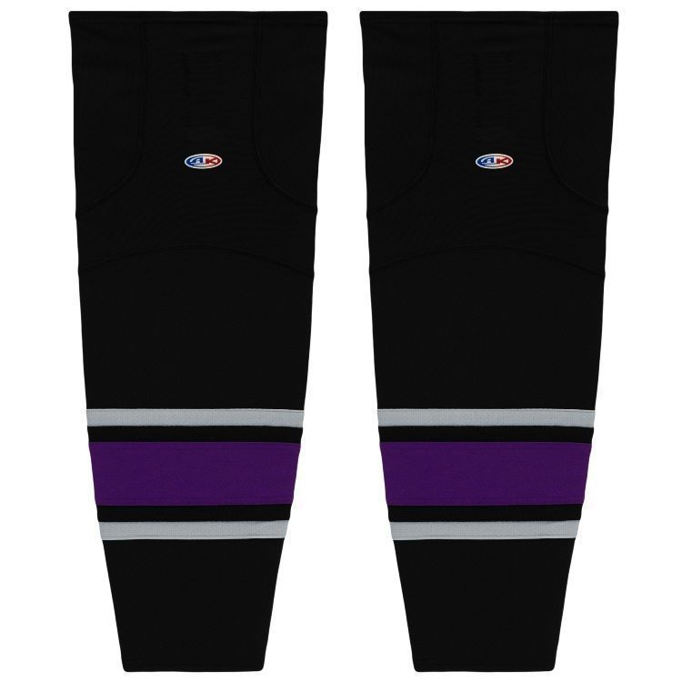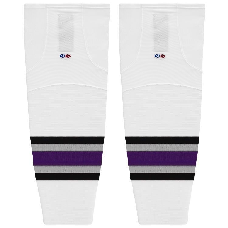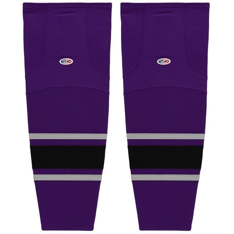 LA Kings air knit hockey socks in home, away and 3rd styles. LA Kings air-knit hockey socks in stock in adult, intermediate and youth sizes in authentic Kings purple, black and white sewn striping. Athletic Knit HS2100 air-knit hockey socks feature pro weight edge style air knit fabric with Dry-Flex wicking stretch panels and two sewn Velcro tabs.