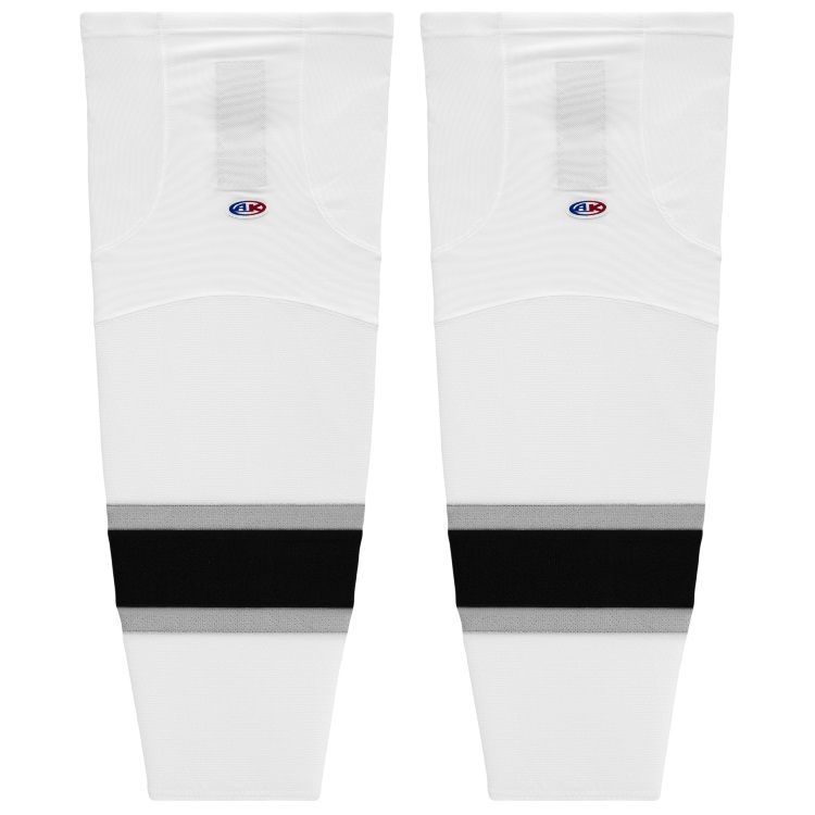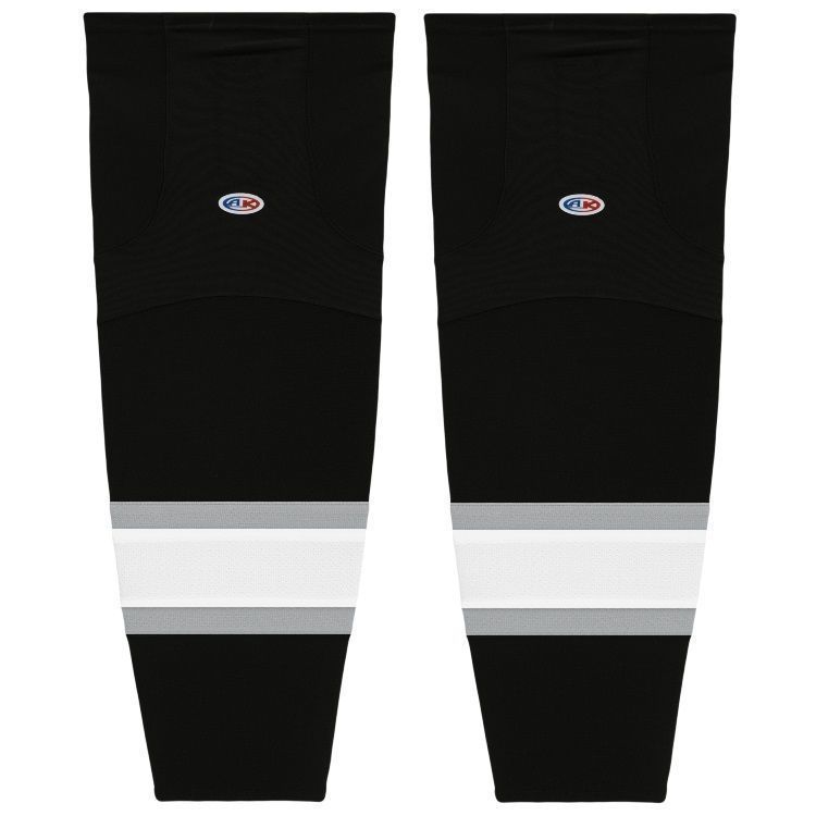 LA Kings old air knit hockey socks in home and away patterns. LA Kings air-knit hockey socks in stock in adult, intermediate and youth sizes in authentic old Kings black, grey and white sewn striping worn from 1988-1997. Athletic Knit HS2100 air-knit hockey socks feature pro weight edge style air knit fabric with Dry-Flex wicking stretch panels and two sewn Velcro tabs.
