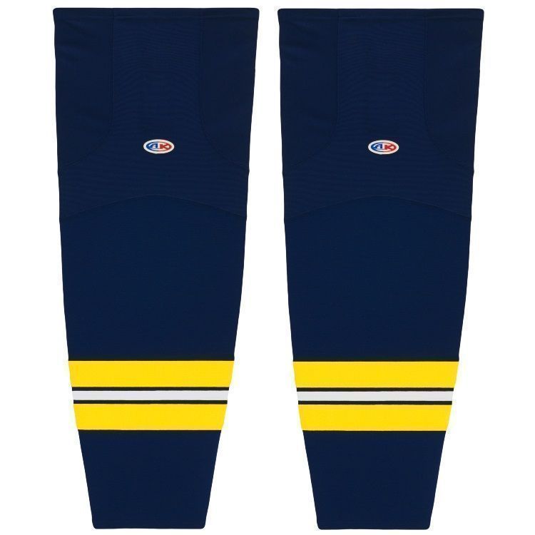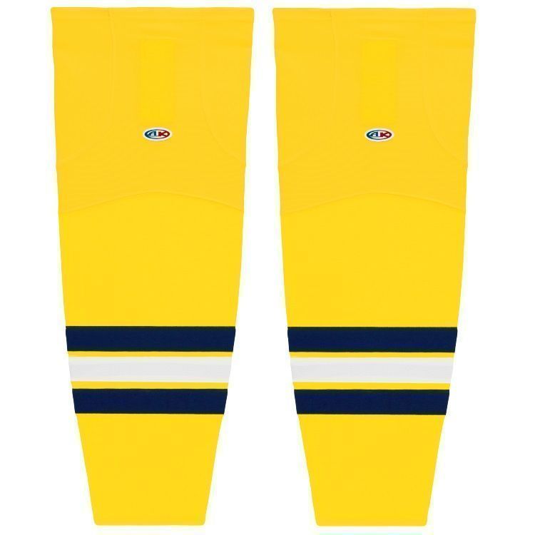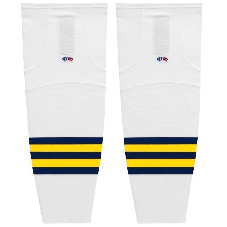 Michigan air knit hockey socks in home, away and 3rd styles. Michigan air-knit hockey socks in stock in adult, intermediate and youth sizes in authentic Michigan maize, blue and white sewn striping. Athletic Knit HS2100 air-knit hockey socks feature pro weight edge style air knit fabric with Dry-Flex wicking stretch panels and two sewn Velcro tabs.